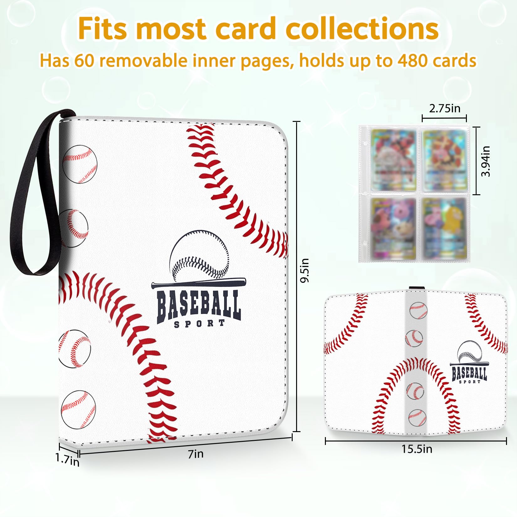 Baseball Card Book 4-Pocket 480 Cards With 60 Removable Baseball Binder Comic Book Protector Baseball Card Holders Baseball Card Binder With Sleeves Trading Card Baseball Card Binder(White Baseball)