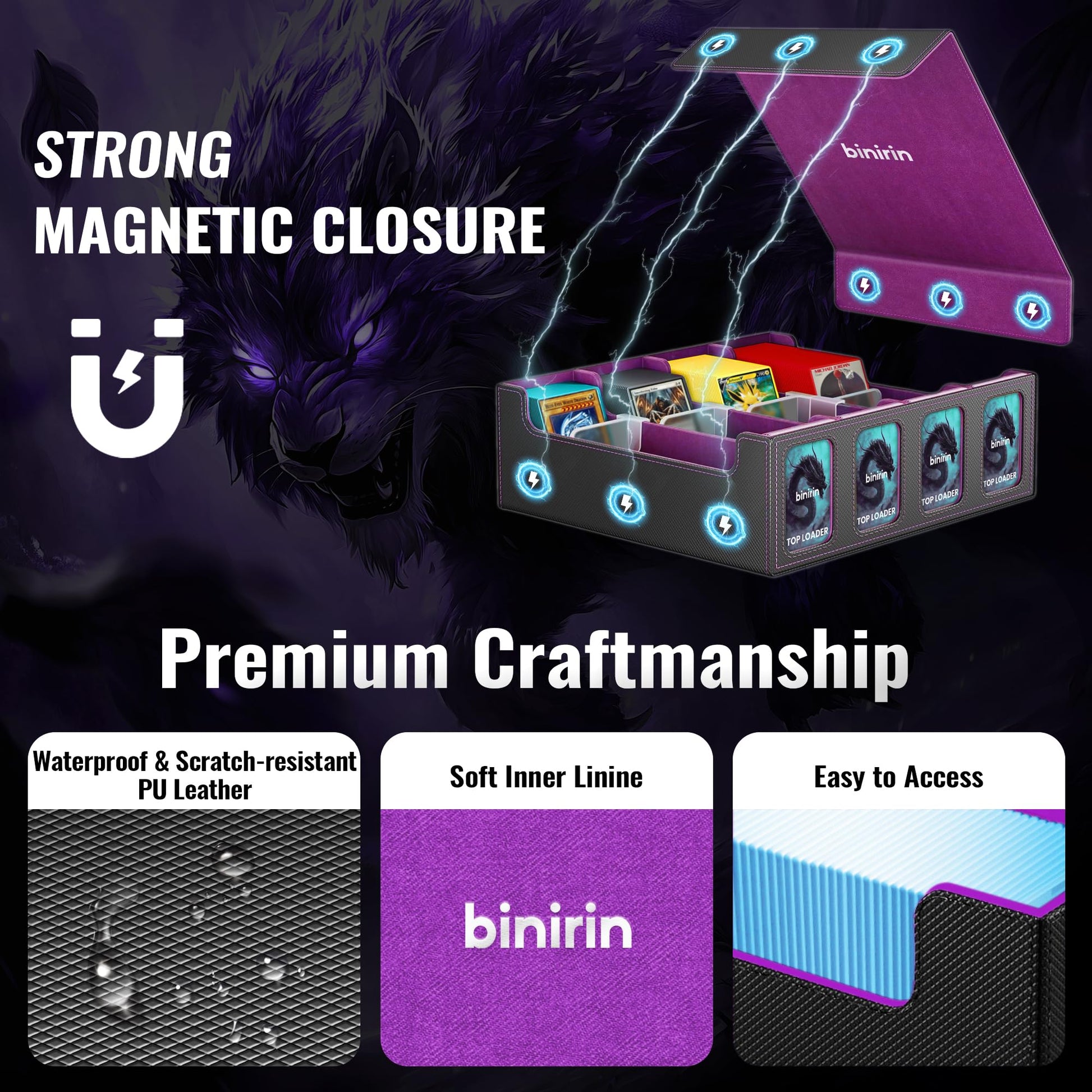 Binirin Deck Boxes offer the best protection for your trading cards. Made from our non-slip, water-resistant Diamond Texture material on the outside with a soft-touch microfiber lining inside. Protect your cards from dinks, dents and scrapes. Keep your valuable cards in mint condition.