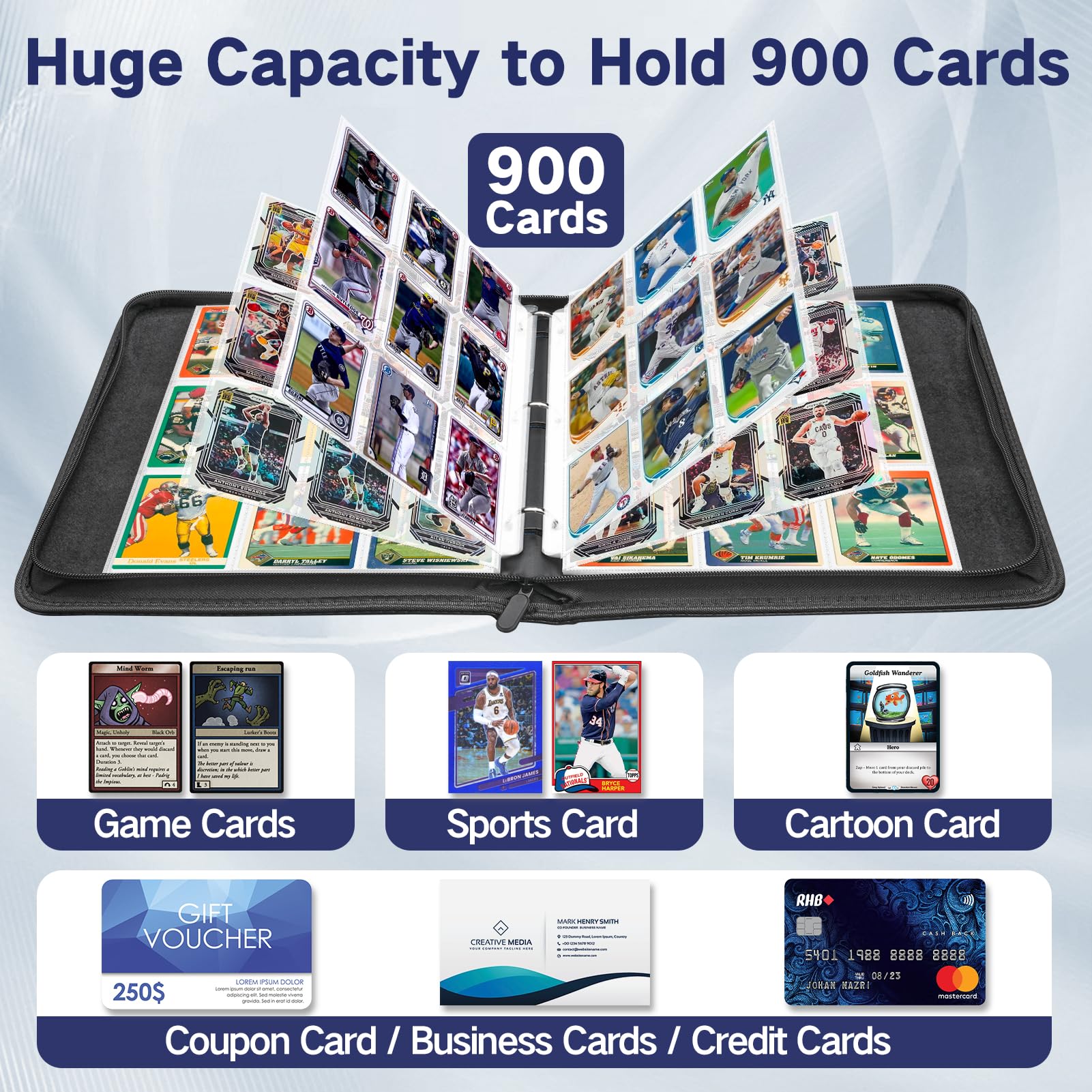 Card Binder 9 Pocket 900 Pockets Trading Card Holder Compatible with Game Cards Baseball Card Football Card enhanced Zipper Case Album Book Storage Gift for Boy and Girls Large Black