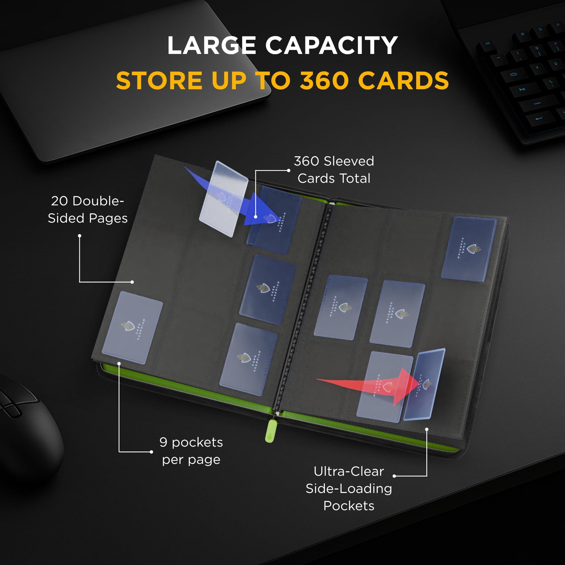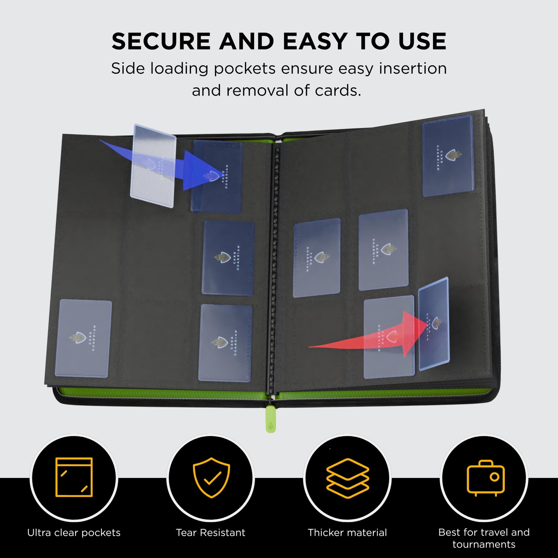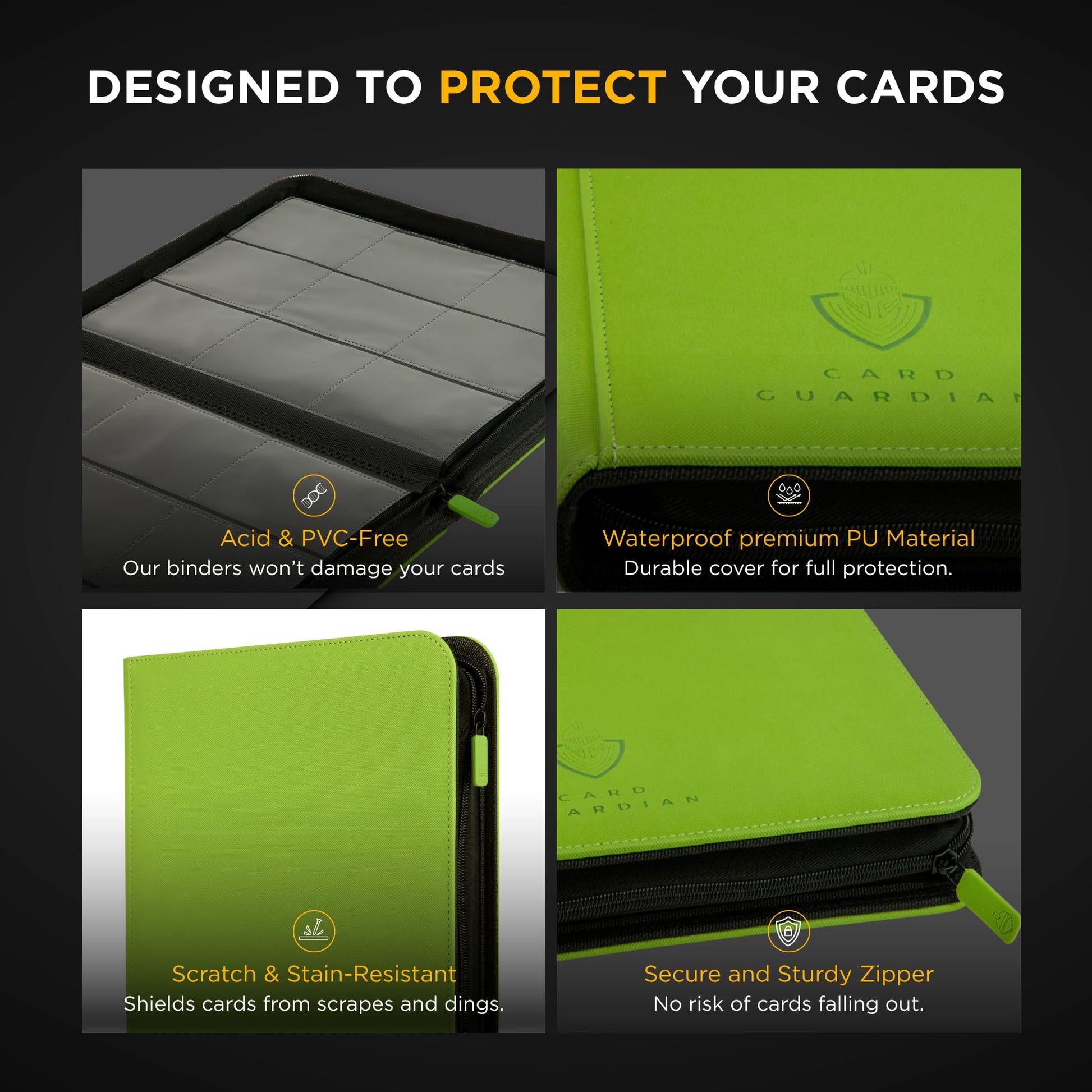 Card Guardian - 9 Pocket enhanced Binder with Zipper for 360 Cards Trading Card Games TCG (Lime Green) - Side Loaded Pockets - Compatible with Yugioh Cards MTG Binder Sports Card Binder
