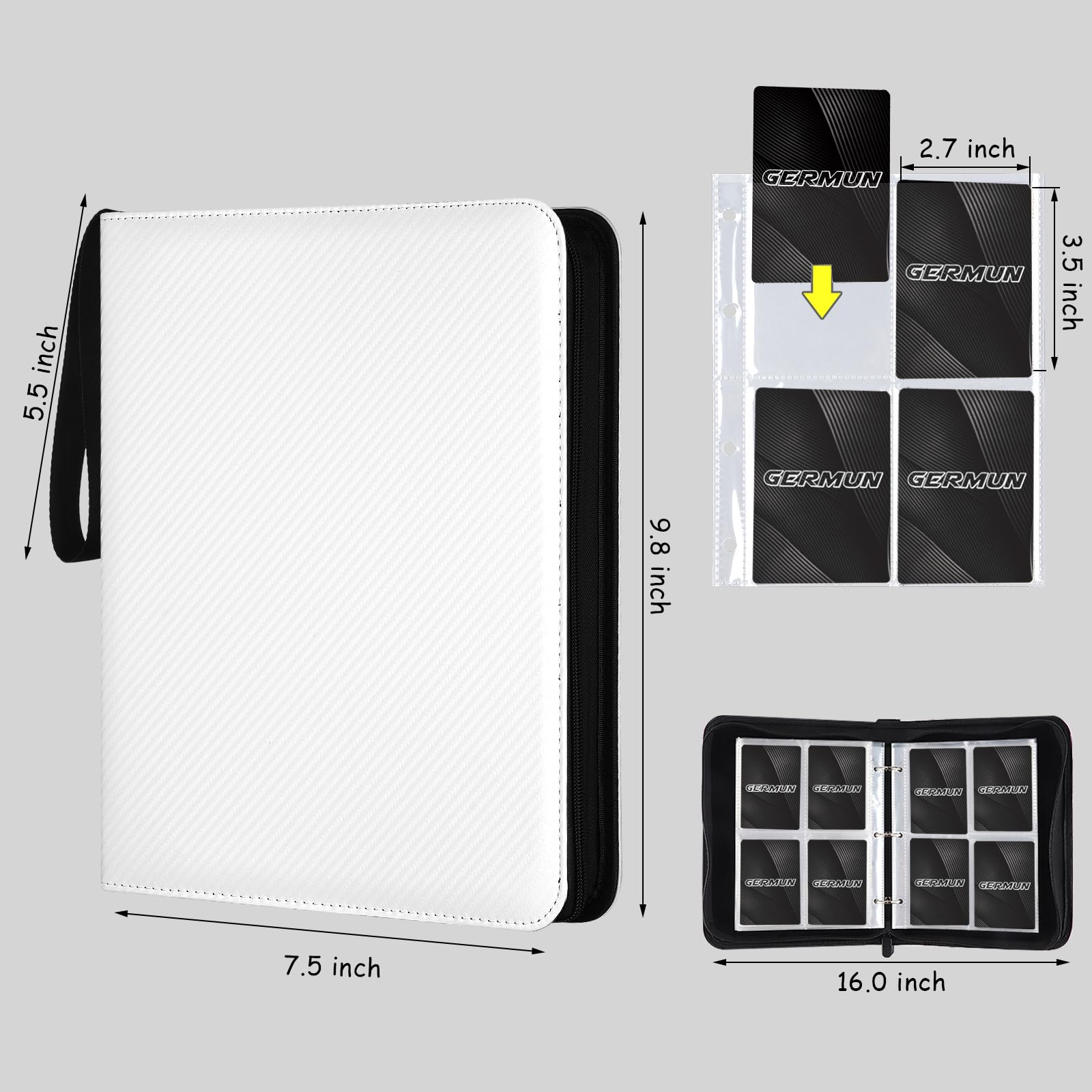GERMUN 4-Pocket Binder for Cards fit for 400 cards: A must have for trading card collector's beautiful and compact card binder for kids to carry around wherever they go get this zipper binder by GERMUN. Features Youll Love: 1. GERMUN 4-Pocket cards binder for trading cards with PVC-Free EVA foam and PU leather2. cards holder for trading card with sleeves with plenty of room to hold 400 trading cards3.binder for trading cards with sleeves have all cards in the binder and not all over the place 4.card binder for trading cards with 50 sleeves compatible with universal standard size trading cards game cards sports cards and more. Perfect Match Standard Binder :Our card binder for trading cards with sleeves is great for trading cards storage keeps your trading cards safe protected and organized! perfect for most. Whats In The BoxA carrying binder with total 400 pockets card sleeves ( 50 pages double-sided use) trading cards are NOT INCLUDED. After Sales Service:Please don't hesitate to reach out to us if you have any issues with your purchase - we're here to help!Our company will reply within 12 hours after receiving the email and resolve it until you are satisfied.