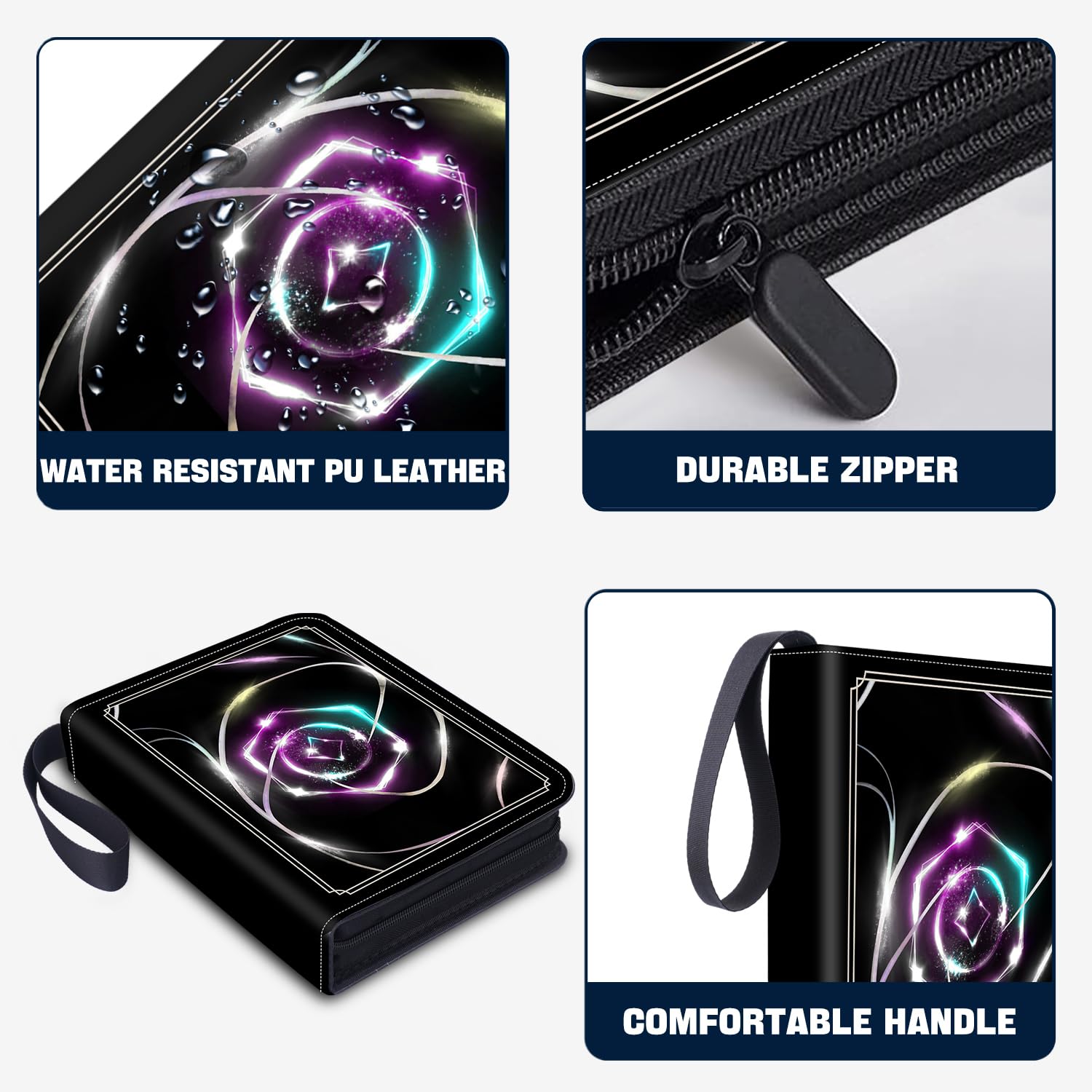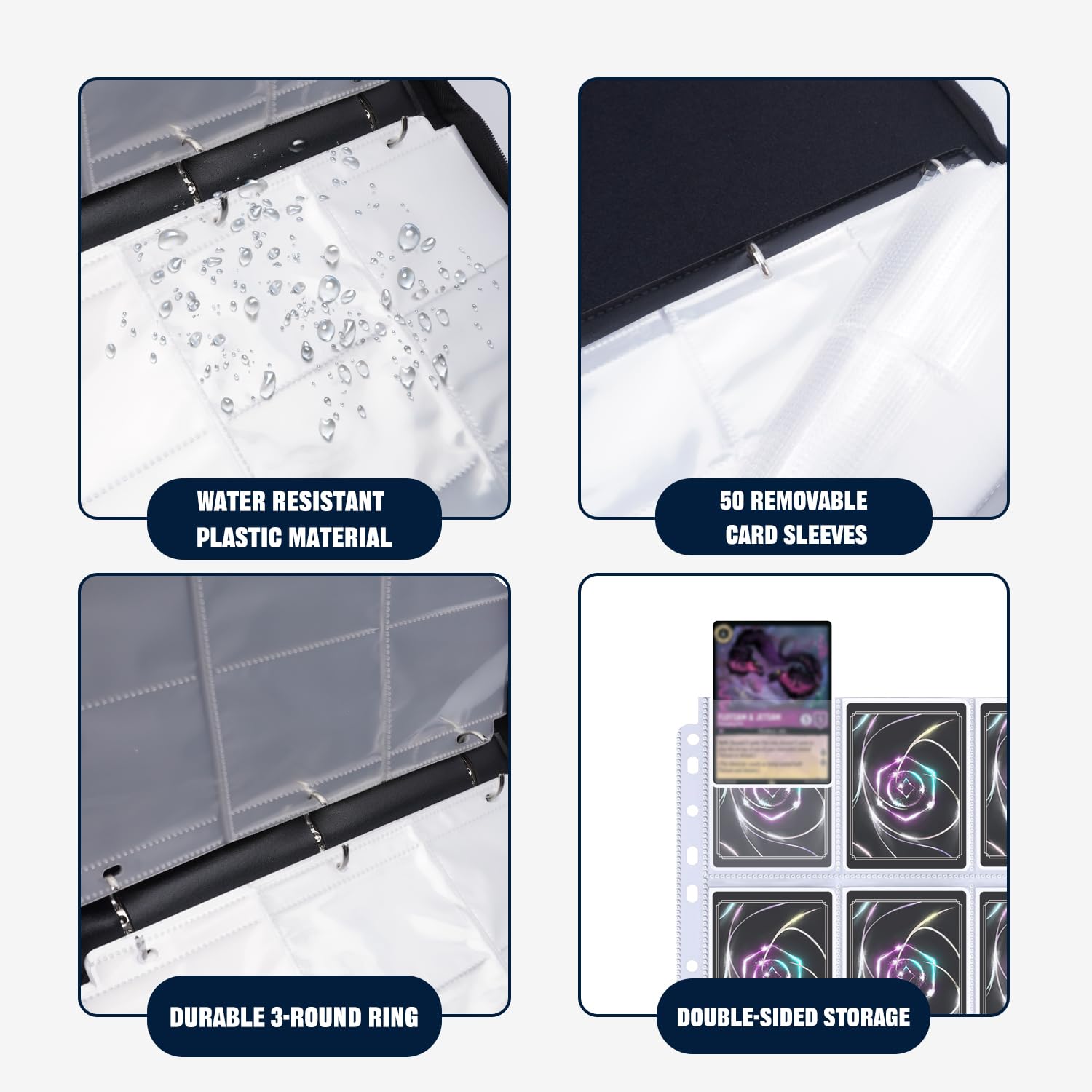 ?An Ideal Gift with Fashion and Practicality?Specially designed for Lorcana card collectors this trading card binder seamlessly integrates fashion with practicality Whether it's a birthday gift or a holiday surprise for kids it undoubtedly captures the hearts of card enthusiasts. ?well-made Materials for Comprehensive Protection?Made from enhanced PU material this Lorcana card binder offers exceptional durability and partial water and oil resistance for your collection's safety Transparent pockets enable easy browsing and cleaning without removing cards while the sturdy zipper ensures cards and pages are securely fixed in place providing comprehensive protection. ?Effortless Organization and Card Management? Large number of trading cards is hassle-free with this trading card holder. It features 9 game-style on each side a double-sided design that can accommodate 50 pages and a maximum capacity of 900 cards Metal rings allow for easy addition or removal of inner pages while the zipper ensures everything stays securely in place. ?Convenience for Daily Use?With a kids-friendly top-loading design this trading card binder allows kids to insert and remove cards effortlessly The wrist strap adds convenience for carrying and the zipper function ensures cards and pages remains securely in place even when the binder is open or closed. ?Suitable for a Wide Range of Collectible Cards?Whether your kids collect Lorcana cards MTG cards TCG cards sports cards game cards or other types of trading cards this trading card binder is the perfect choice It is compatible with all standard-sized collectible cards ensuring they are stored safely and securely (Inner page size: 3.6 * 2.8 inches)