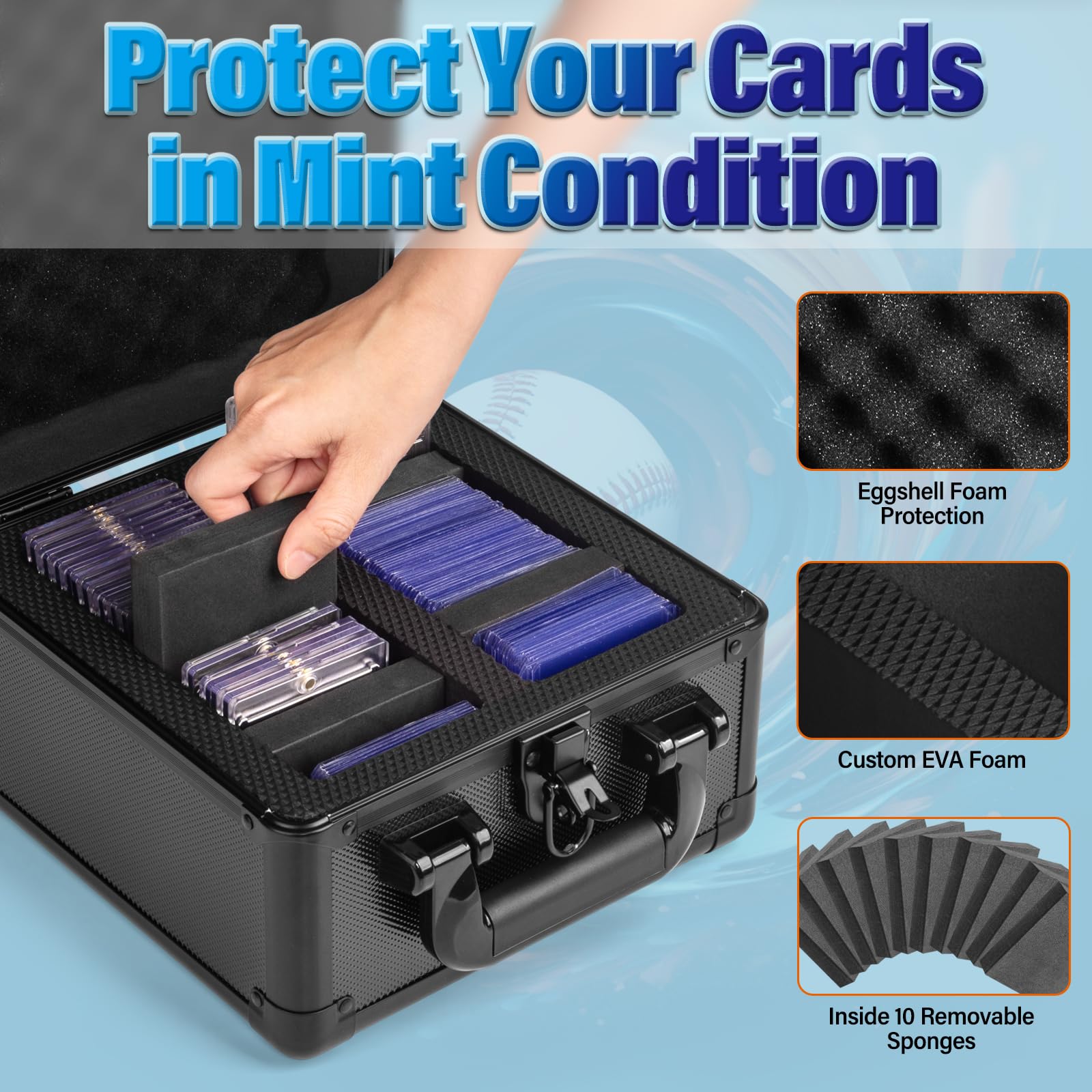 MewVeer enhanced Card Storage Box Compatibility for Diverse Cards Collections Our top loader storage box is the epitome of versatility designed to accommodate a wide range of card types. With the capacity to hold up to 70 PSA graded cards 250+ top loaders or 1500+ unsleeved cards it's perfect for cards collectors with varied interests. Please note that this box is not suitable for SGC cards. Ultimate Protection for Your Prized Cards Your top loaders collection deserves the best defense. Unlike other storage boxes ours is crafted with a hard shell plastic exterior offering exceptional protection from shocks dust and moisture. Safeguard your cards and ensure they remain in pristine condition. Designed for Top Loaders Our storage box is specifically designed for top loaders making organization a breeze. Effortlessly store and access your trading cards with this spacious case which not only keeps your collection neat and tidy but also enhances its aesthetic appeal. well-made Materials Constructed with an aluminum alloy frame our storage box is both strong and lightweight. The exterior is adorned with a sleek ABS veneer while the interior is lined with soft EVA material providing a elegant touch. With two card game-style equipped with ten soft sponges your cards are cradled in comfort and safety. The Perfect Gift for Card Enthusiasts Portability and convenience are not afterthoughts; they're integral to our design. With a comfortable handle for easy transport this storage box is not just a storage solution - it's the ultimate gift for trading card enthusiasts. Ideal for those who value organization protection and ease of use it's a gift that will be cherished by any collector.