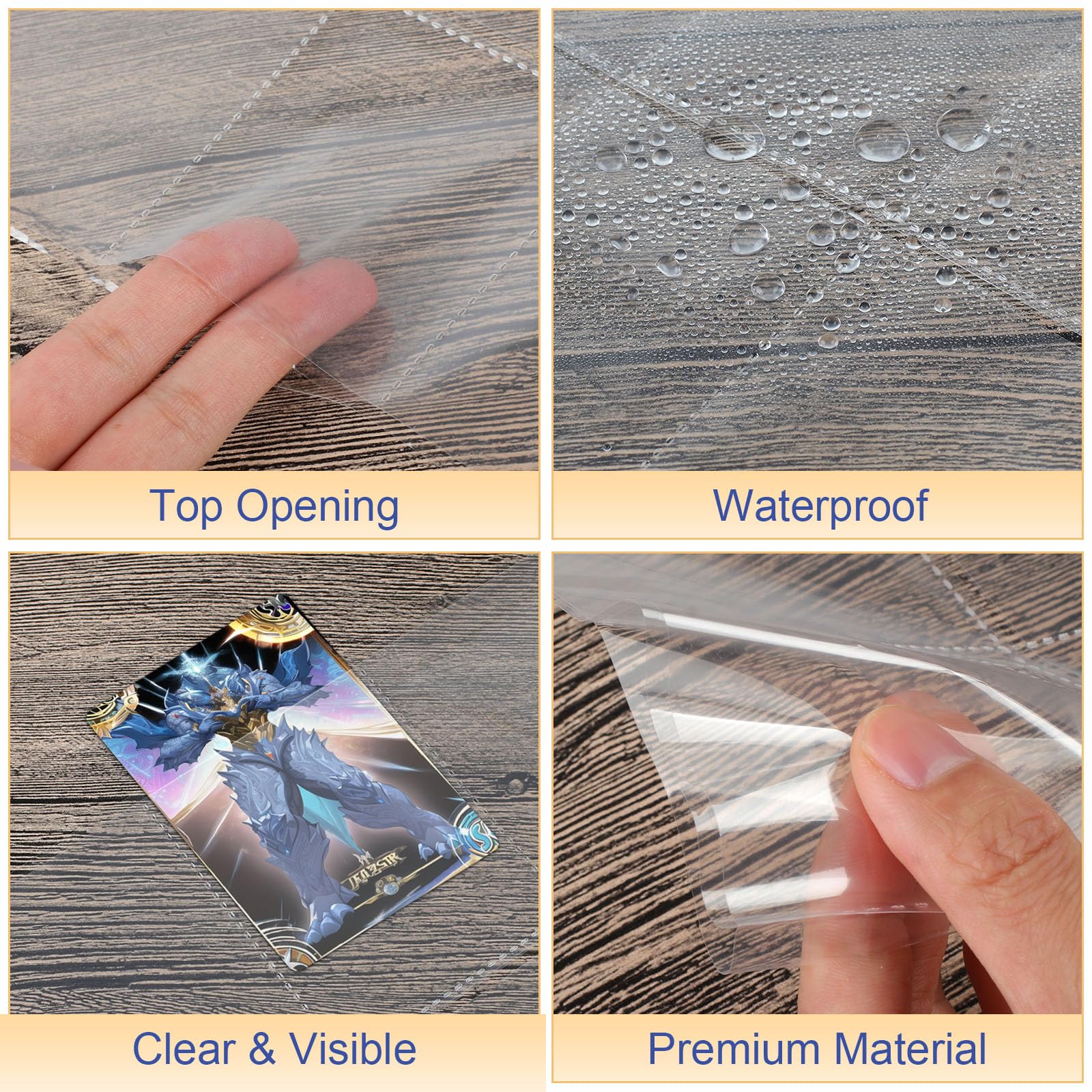 Quantity: 50 Pack. Color: Clear. Size: Pages measure 8.8 x 11.4 inches pockets measure 2.6 x 3.6 inches. Material: Plastic. The double-sided top-opening binder card sleeves are easy to access and we've pre-drilled 11 holes so that it will fit any standard ring binder such as the 2/3/4/11 ring standard binder.