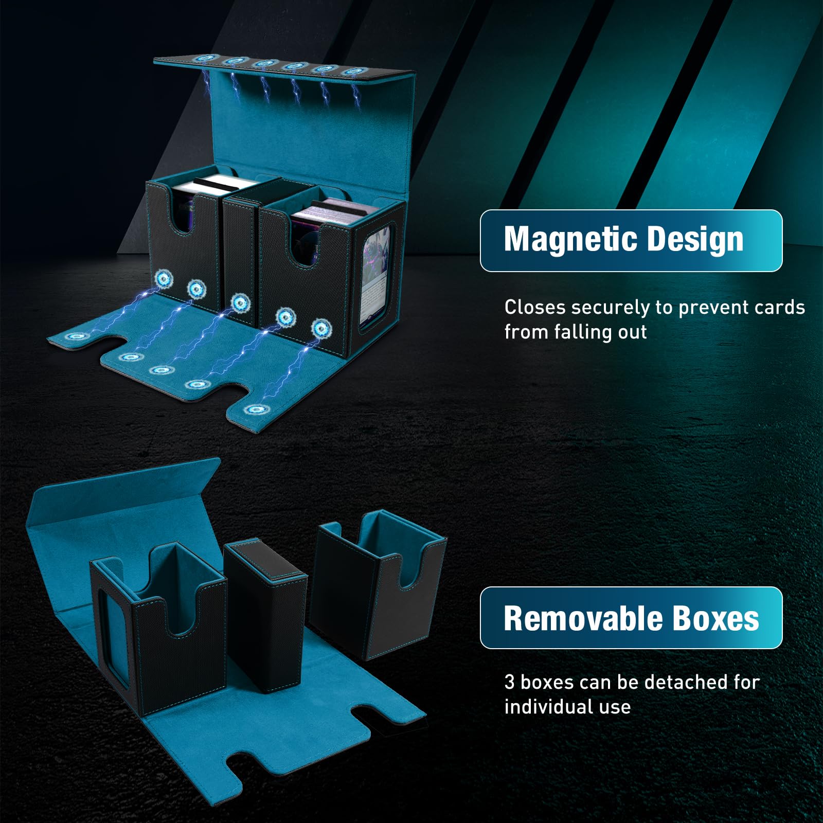 TiMOVO MTG Deck Box Commander Deck Case Fits 200+ Double-Sleeved Cards Magnetic Leather Card Storage Box with 2 Commander Display & 4Dividers & Dice Tray Fit YuGiOh TCG CCG Magic Cards Black Cyan