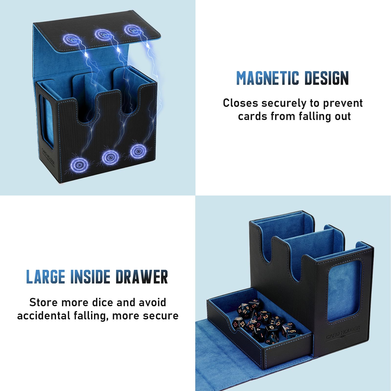 TiMOVO MTG Deck Box MTG Commander Card Deck Box with Commander Display & Dice Tray Fits 400+ Unsleeved Cards Leather Magnetic Card Storage Case with 6 Dividers for TCG CCG Magic Cards Black+Blue