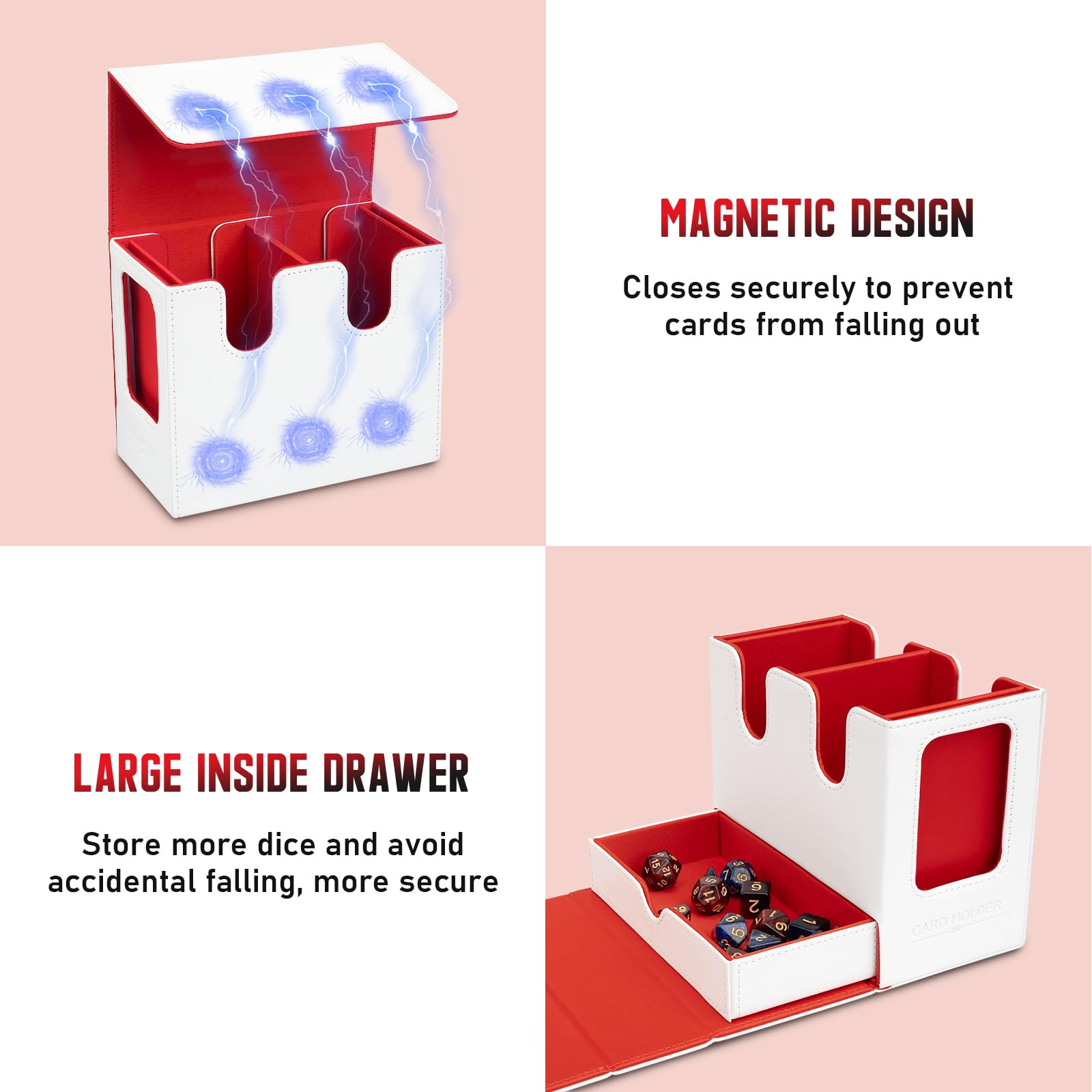 TiMOVO MTG Deck Box MTG Commander Card Deck Box with Commander Display & Dice Tray Fits 400+ Unsleeved Cards Leather Magnetic Card Storage Case with 6 Dividers for TCG CCG Magic Cards White + Red