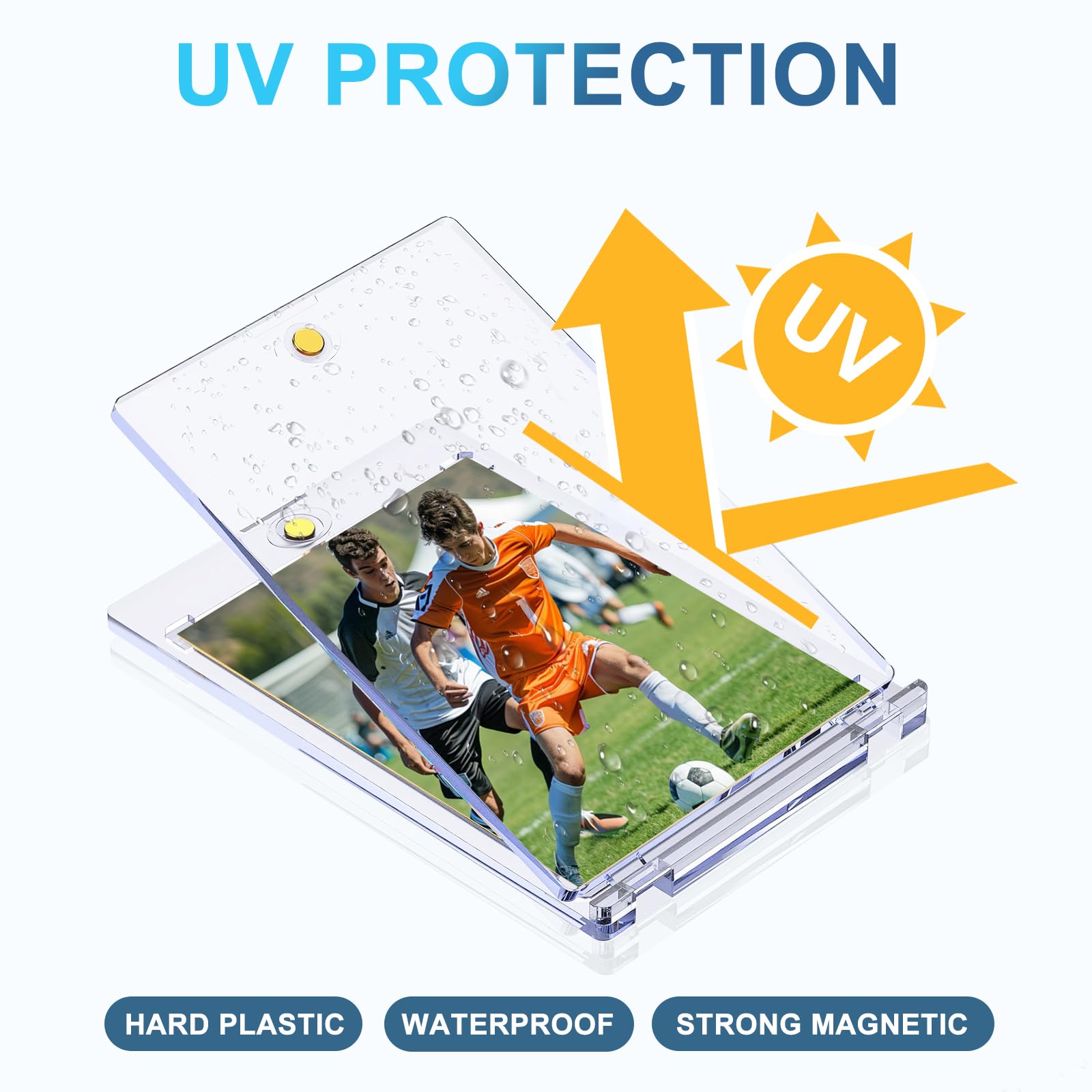 Features: Upgraded Sturdy Material: Our 35pt magnetic card holders for trading cards are crafted from enhanced thick acrylic material that is crystal-clear offering excellent visibility and sturdy protection. These one card touch holders effectively shield your cards from water moisture dust UV rays bending and scratches keeping them in pristine condition. enhanced U-V Protection: Our magnetic card holders feature a well-made UV coating that protects your trading cards from sunlight and prevents fading. Preserve the vibrant colors of your valuable cards with ease. Each baseball card holder is individually packaged making it perfect for trading cards while preventing scratches during shipping. Package Includes: 120 x 35pt Magnetic Card Holders Specifications: Material: Hard PlasticColor: ClearInner dimensions: 2.52 x 3.52 inchesOuter dimensions: 2.87 x 4.33 inchesThickness: 35 point Tip: ? Press on the magnet area when closing the card holder to ensure a more seseal.
