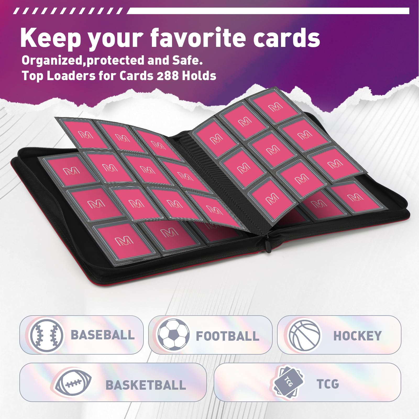 Toploader Binder Trading Card Binder Storage Hold up 288 Cards 9-Pocket Top Loader Binder with Sleeves for 3x4 Rigid Toploaders Hard Cases (9Oxblood Red)
