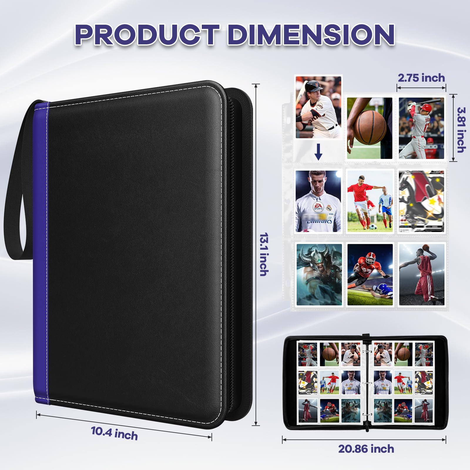 ?enhanced Details? The card binder for trading cards is made of enhanced PU leather Water or raindrops wont seep through. the black card sleeves' main material is clear polypropylene durable quality Acid Free waterproof super sturdy that won't get cards bend up protect your card from fading and stain. ?The Perfect Gift ?The exquisite appearance and beautiful color matching of our binders can be very attractive to children. It is very suitable as a gift for children who like to collect which will undoubtedly be a great surprise for them. ?Wide Applications? LANFROM card holder binder meets all your collectible needs - it is compatible with standard-sized trading cards such as MTG cards Game King card games Fuji Mini Polaroid photos business cards baseball cards basketball cards and other collectible cards.