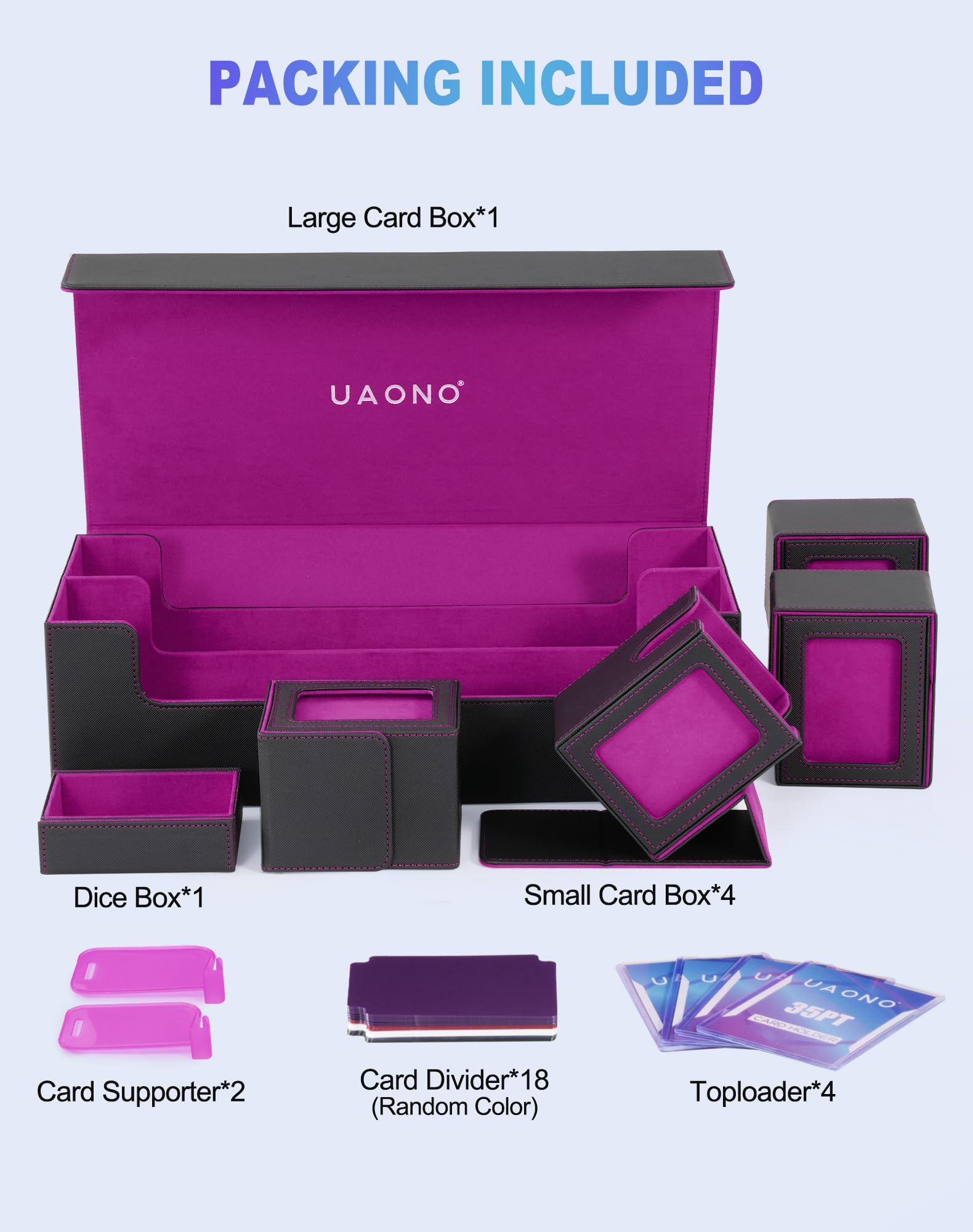 UAONO Card Storage Box for Trading Cards 5 in 1 Card Deck Case with 4 Pcs Small Commander Deck Box Large Card Box for MTG/TCG/PTCG Magic Sports Cards Game Playmat (Black Purple)