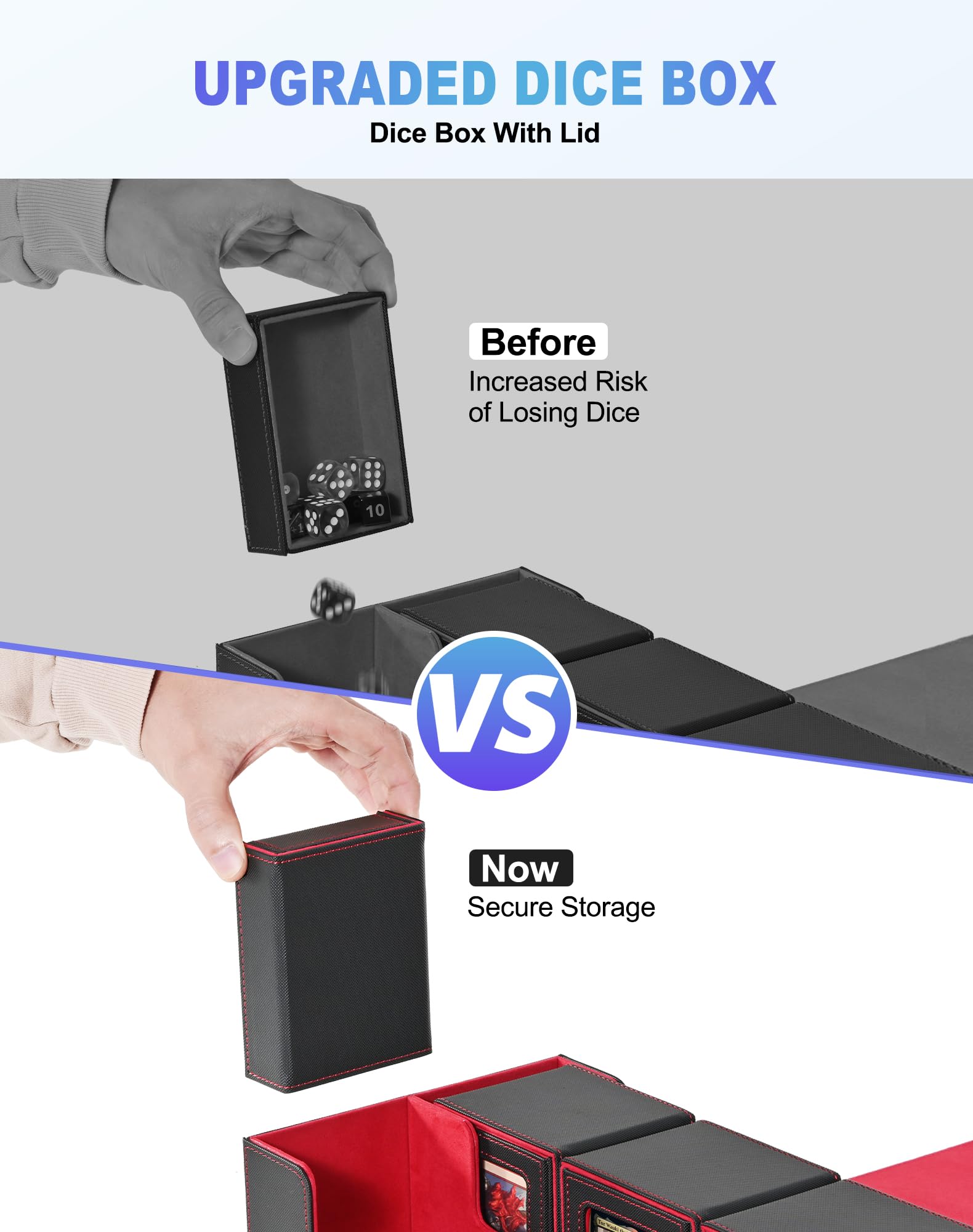 Extensive compatibility: Perfectly compatible with Magic The Gathering PTCG dragon shield YuGiOh Star Wars X-Wing Game of Thrones WoW Force of Will Legend of the Five Rings Cardfight Vanguard Duel Masters Panini football Baseball football basketball cards along with many more collectible card games. Specifications: Material: PU leather Color: Black Red Dimension: 40.8*19.6*12.2cm/16.1*7.7*4.8 inch Weight: 2.38kg Package includes: 1* trading card storage box; 10* card dividers; 2* card supporters; 1* dice box; 4* small deck box(each one has 2 dividers and 1 toploader) Notes: Manual measurement please allow slight errors on size. The color may exist a slight difference due to different screen displays. If you are at all unsatisfied with your purchase please contact us right away and we will listen to your concerns and our Customer Service Team will come up with solution for the situation.