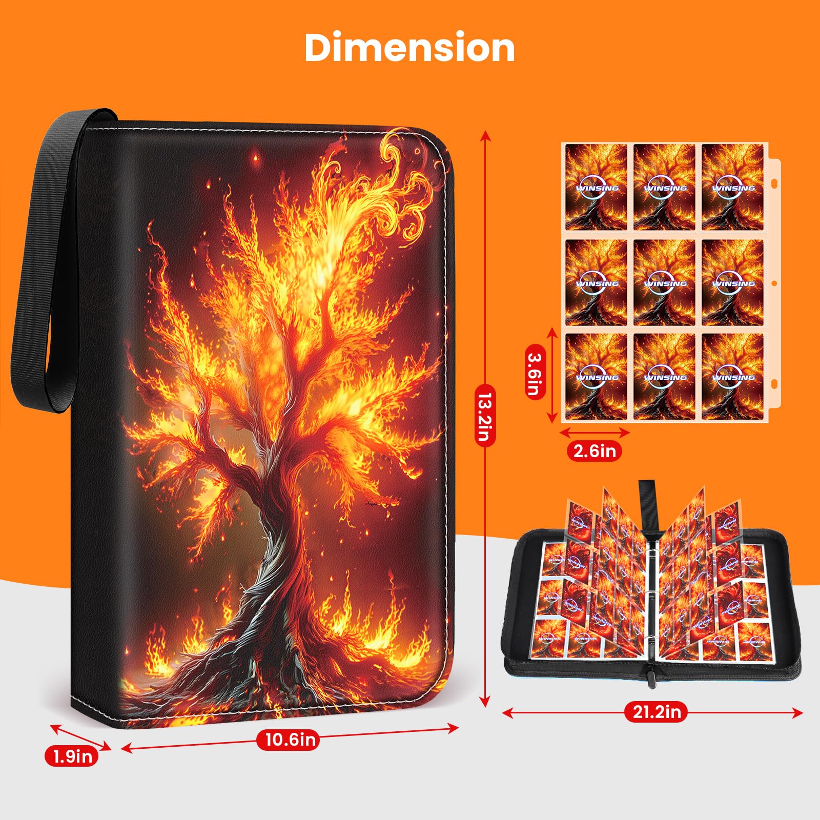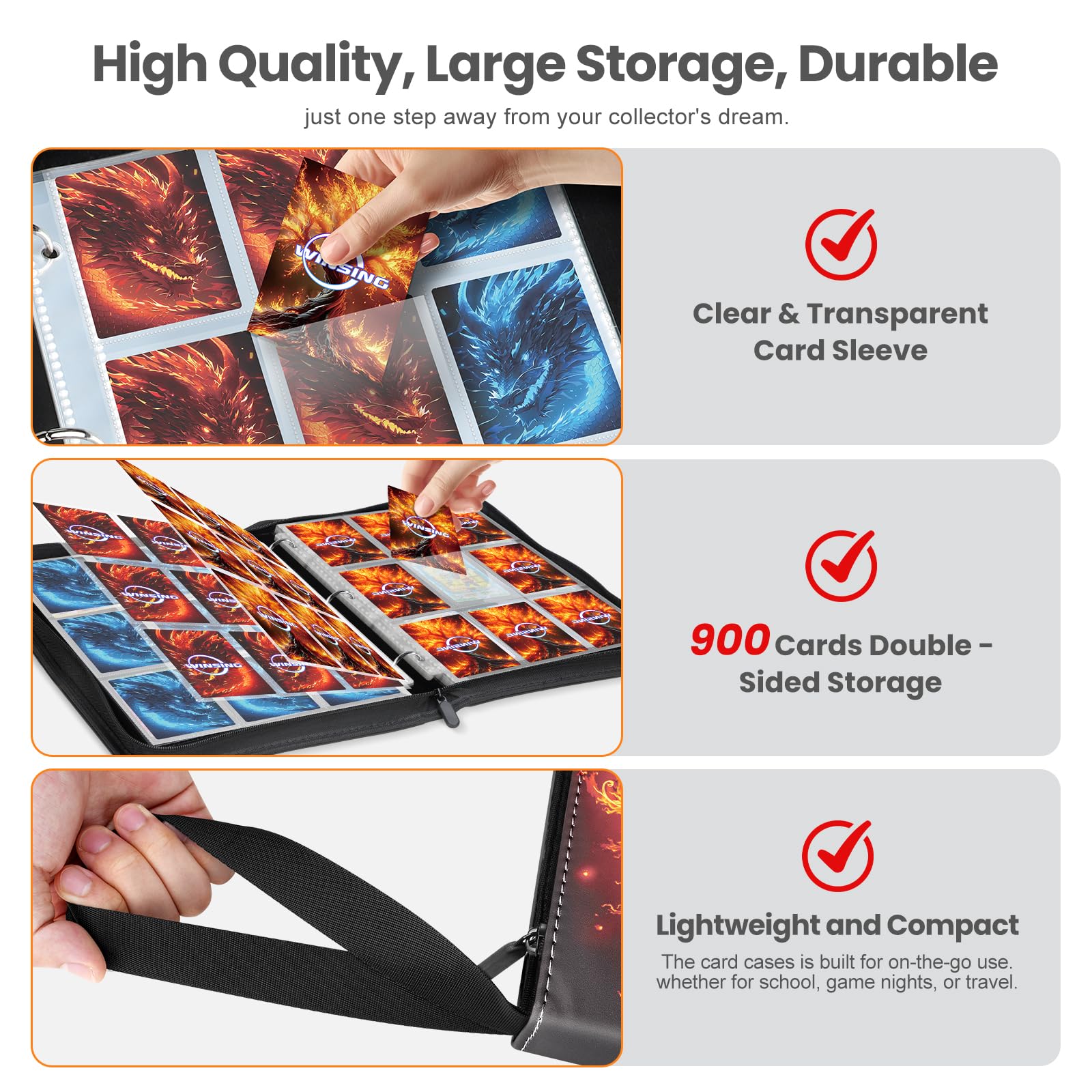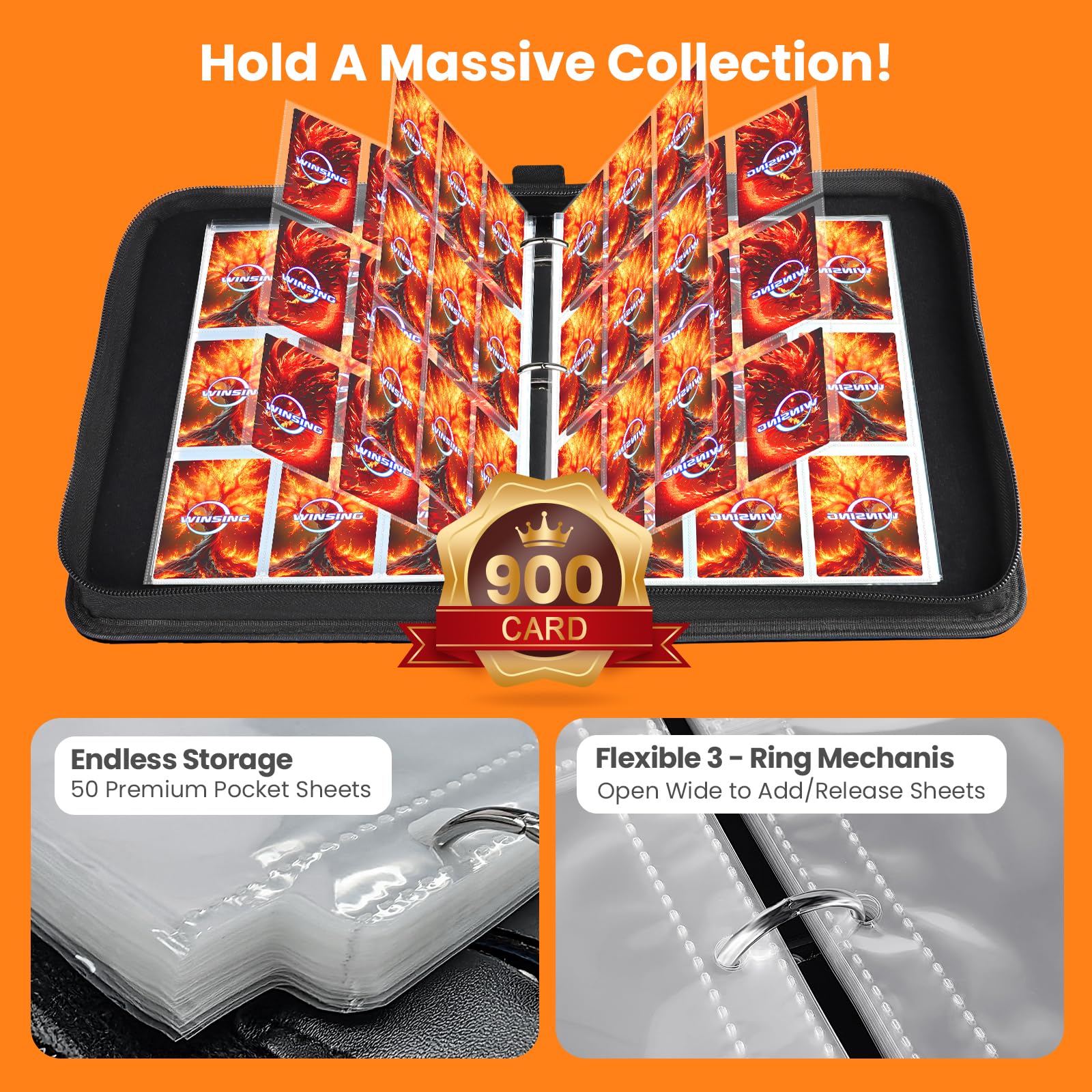Why Choose Winsing Trading Card Binder? enhanced PU Materials - The surface of the Winsing card binder 9 pocket for game card is very soft and comfortable to touch and is waterproof and dirt-proof. If there is water or dust on the surface just wipe it with a paper towel. Large Capacity - Winsing binder for 900 cards can hold 900 cards including various standard size cards such as baseball card game card Football cards PECS cards Credit cards. Take It Anywhere - card binder 900 pockets has fulfilled wristband and small size which can be carried to school or friends' home to share with friends classmates. Waterproof & Built to Last:This card binder survives rainy days and messy adventures! Heavy-duty waterproof PU leather + double-stitched seams block spills and humidity. Tested to withstand 10 000+ zips - your cards stay pristine for decades not just seasons. Product Specification: Size: 13.2 * 10.6 * 1.9 Pocket size: 2.6 x 3.6 for each pocketWeight:2.57 lbPages: 50 (Can be removed and added) Pockets: 900 Question: Q1:Will the card bend when the binder is full?A1:No. It won't. The card binder has a lot of space enough for you to hold many cards and protect the cards from bending.Q2:Do these hold standard-sized baseball cards/football cards?A2:They hold baseball cards and football cards from the 1980's with no problem.Q3:Are the pages non-PVC polypropylene?A3:Yes they are.Q4:Will the 900 binder fit more sheets?A4:Of course more sheets can be added to the binder.
