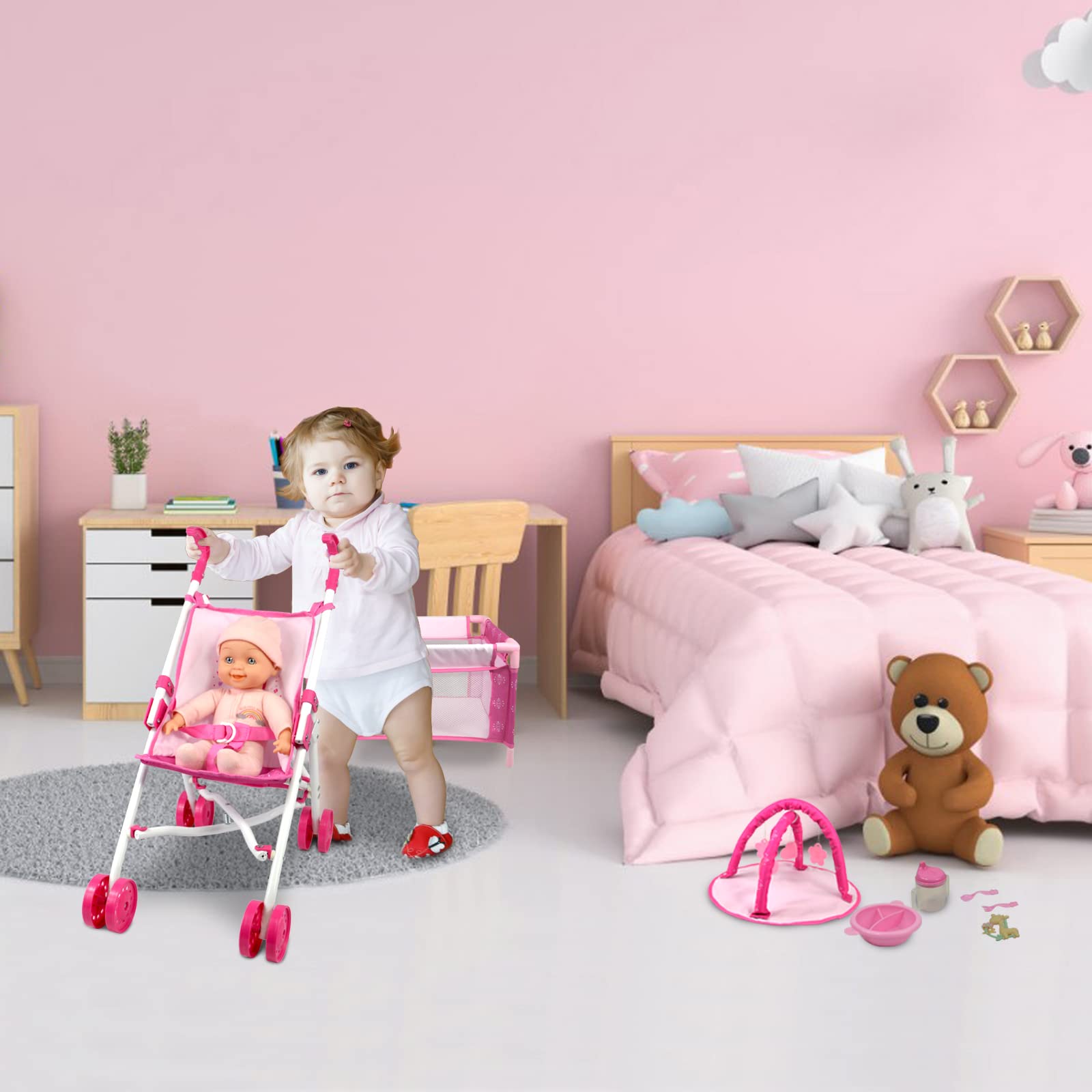 View compareAnivia 5Pcs Baby Doll Stroller Set - Baby Doll Accessories Set Includes Doll Stroller/Doll Crib/Play Mat/Feeding Toy/Diaper Bag, Nursery Role Play Set (11' Doll Included)