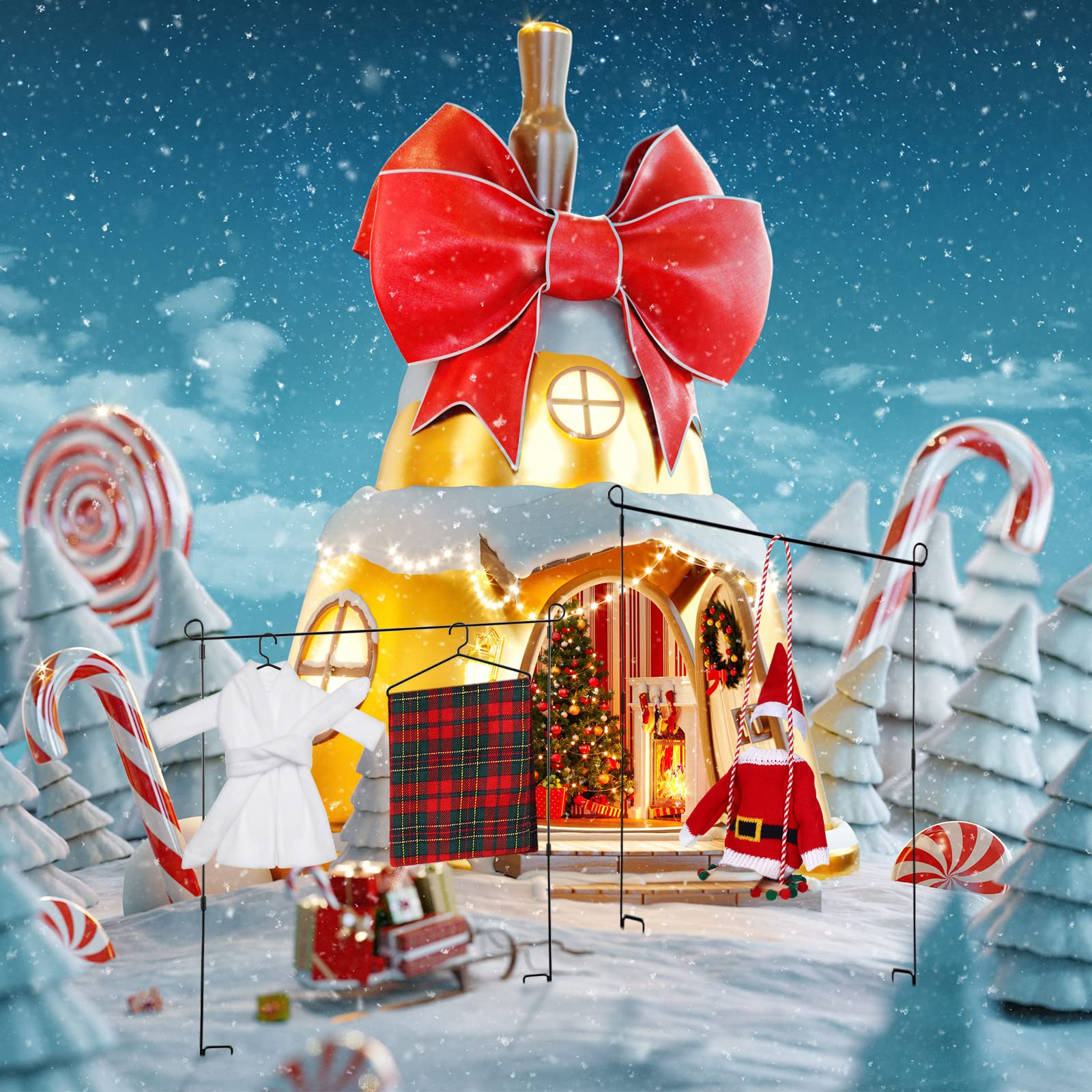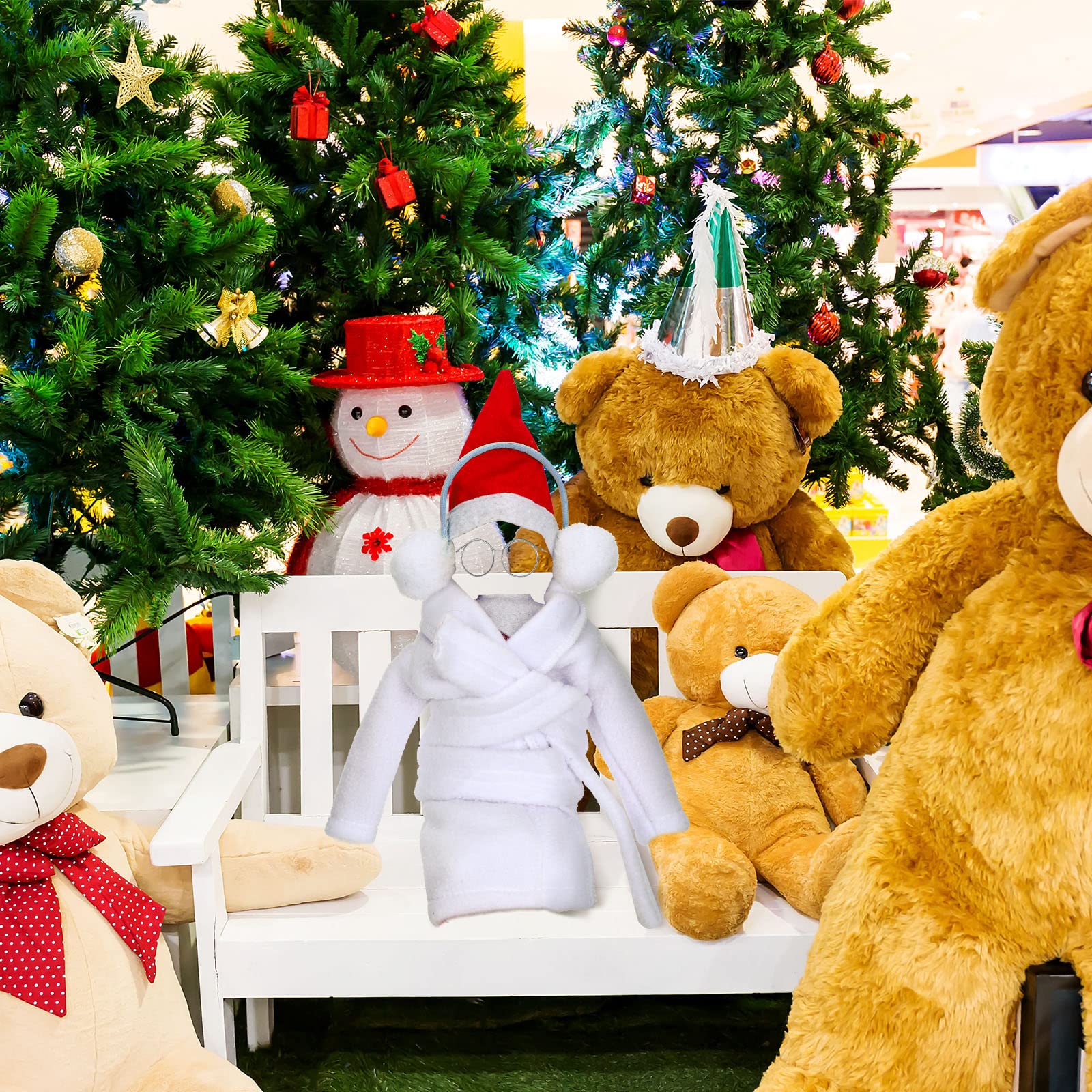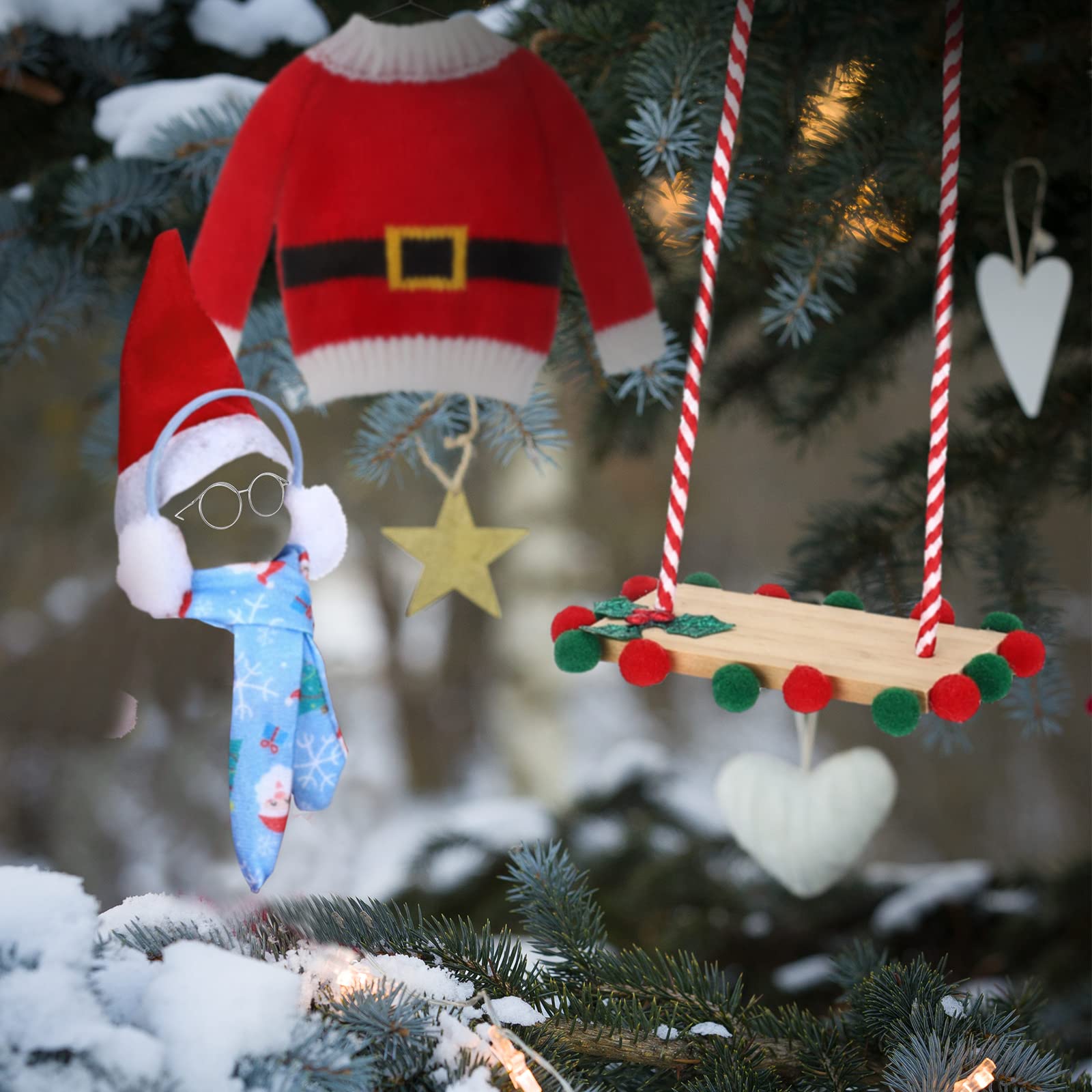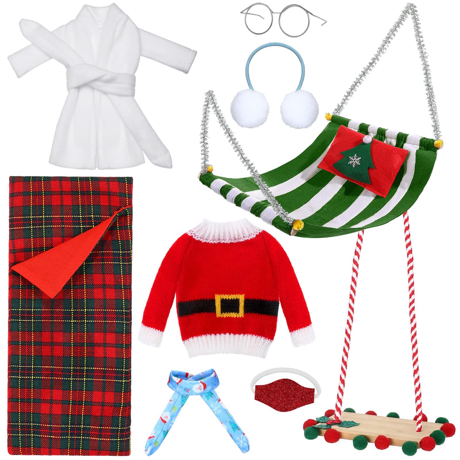 - Q: What accessories are included in the Aoriher Christmas Elf Doll Accessories Set? A: The Aoriher Christmas Elf Doll Accessories Set includes 9 pieces: a plaid sleeping bag, a white bathrobe, eyeglasses, a green and white striped hammock with a pillow, a red doll face mask, a blue scarf, ear muffs, a swing, and Santa's sweater.