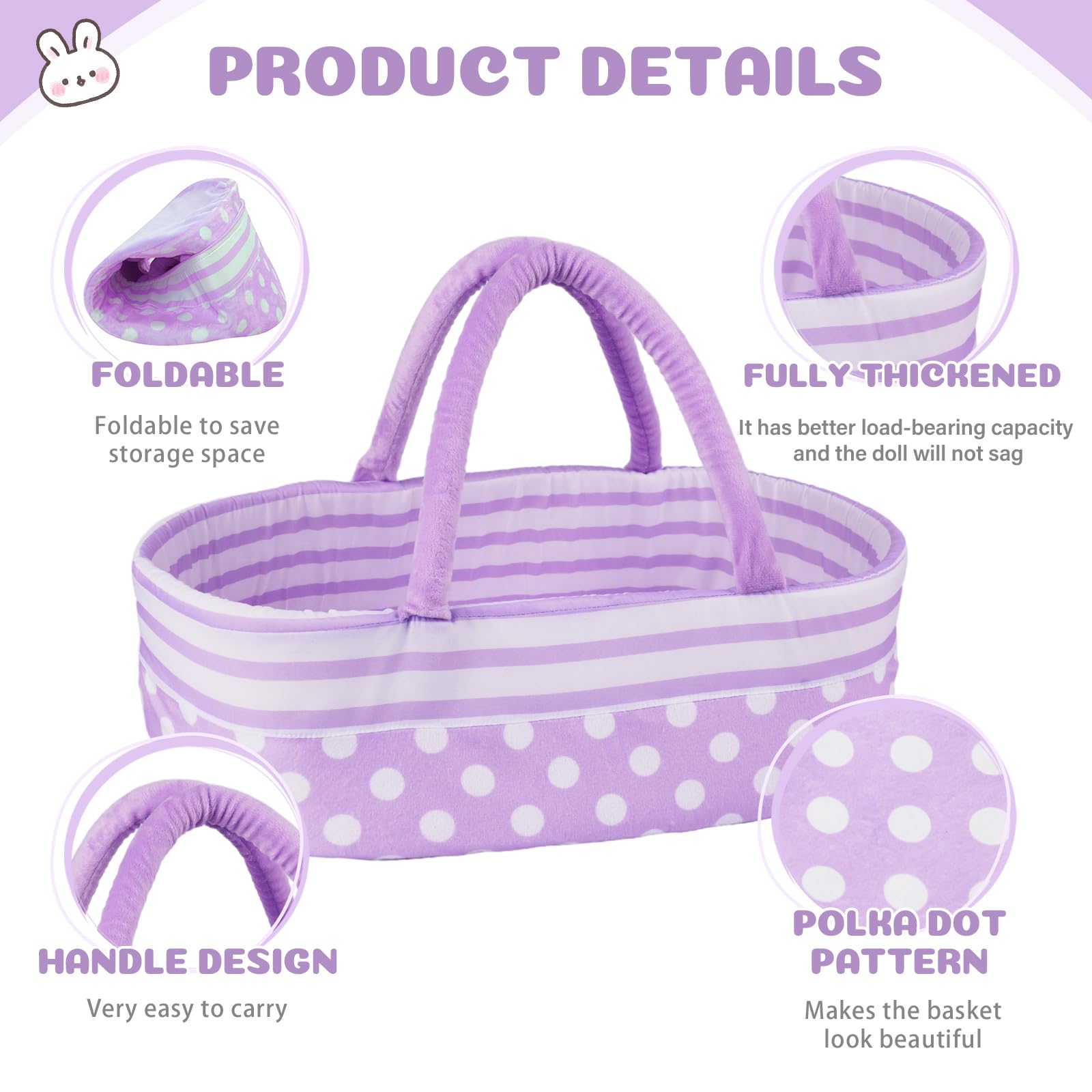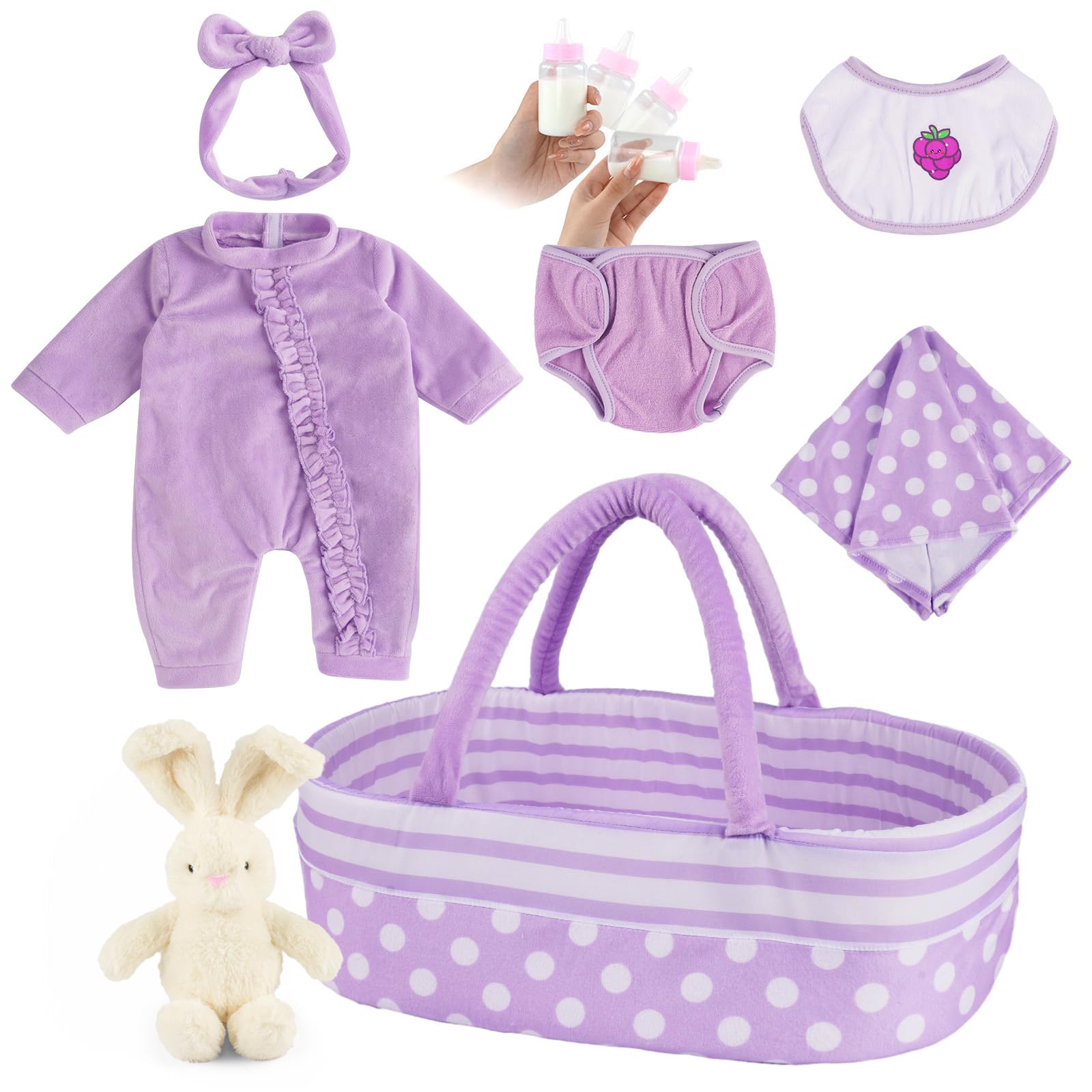 - Q: What accessories are included in the BABESIDE baby doll clothes set? A: The set includes 8 accessories: a purple dot bassinet, a diaper, a bib, a plush toy, a towel, doll clothes, a headband, and a feeding bottle, enhancing the play experience for children.