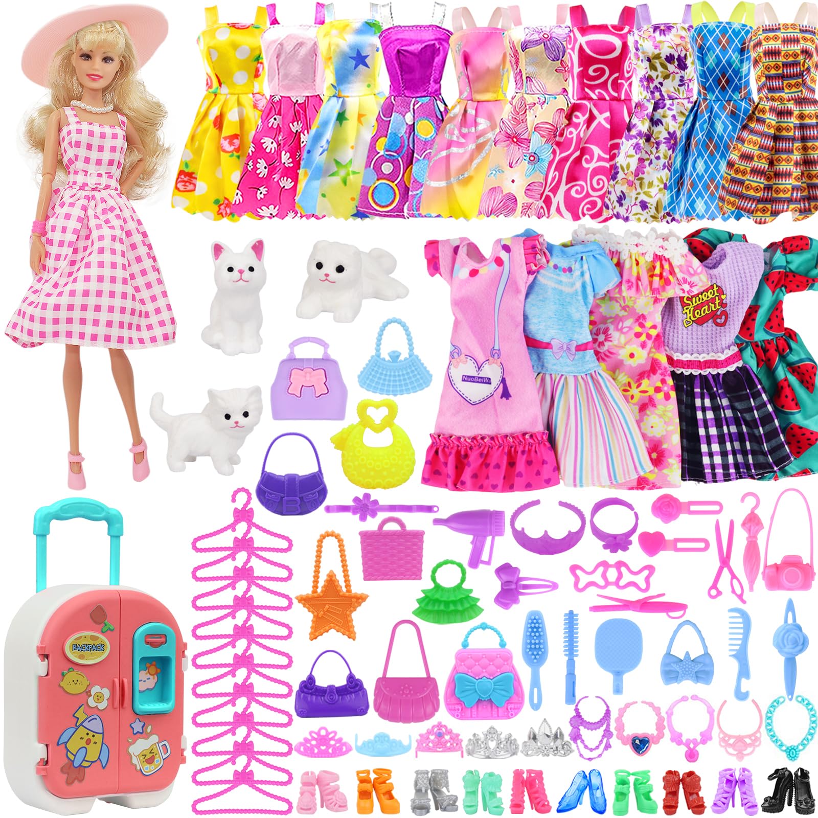 - Q: What accessories are included in the K.T. Fancy 83 Pcs Dolls & Accessories set? A: The K.T. Fancy set includes a doll closet, travel suitcase, 20 different style dresses, 10 pairs of shoes, 5 necklaces, 5 crowns, 10 fashion bags, and 10 random accessories. Please note that the doll is not included.