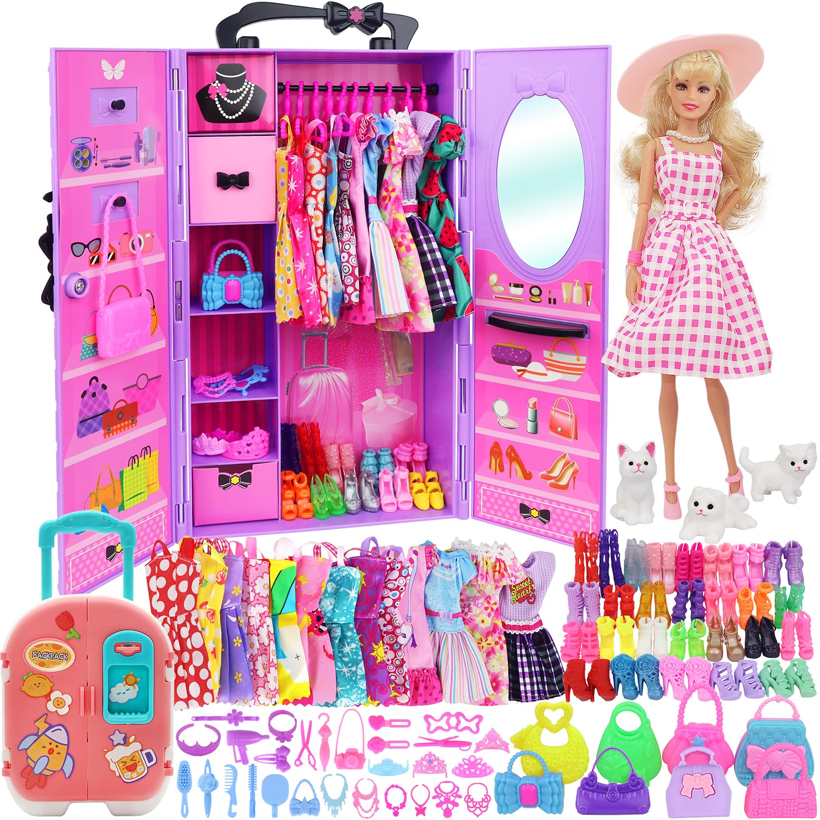 K.T. Fancy 83 Pcs Dolls & Accessories With Doll Closet Wardrobe For 11.5 Inch Doll Dress Up Set Including Wardrobe Shoes, Wallet, Dress Hangers, Brush, Necklace, Pet And Other Accessories