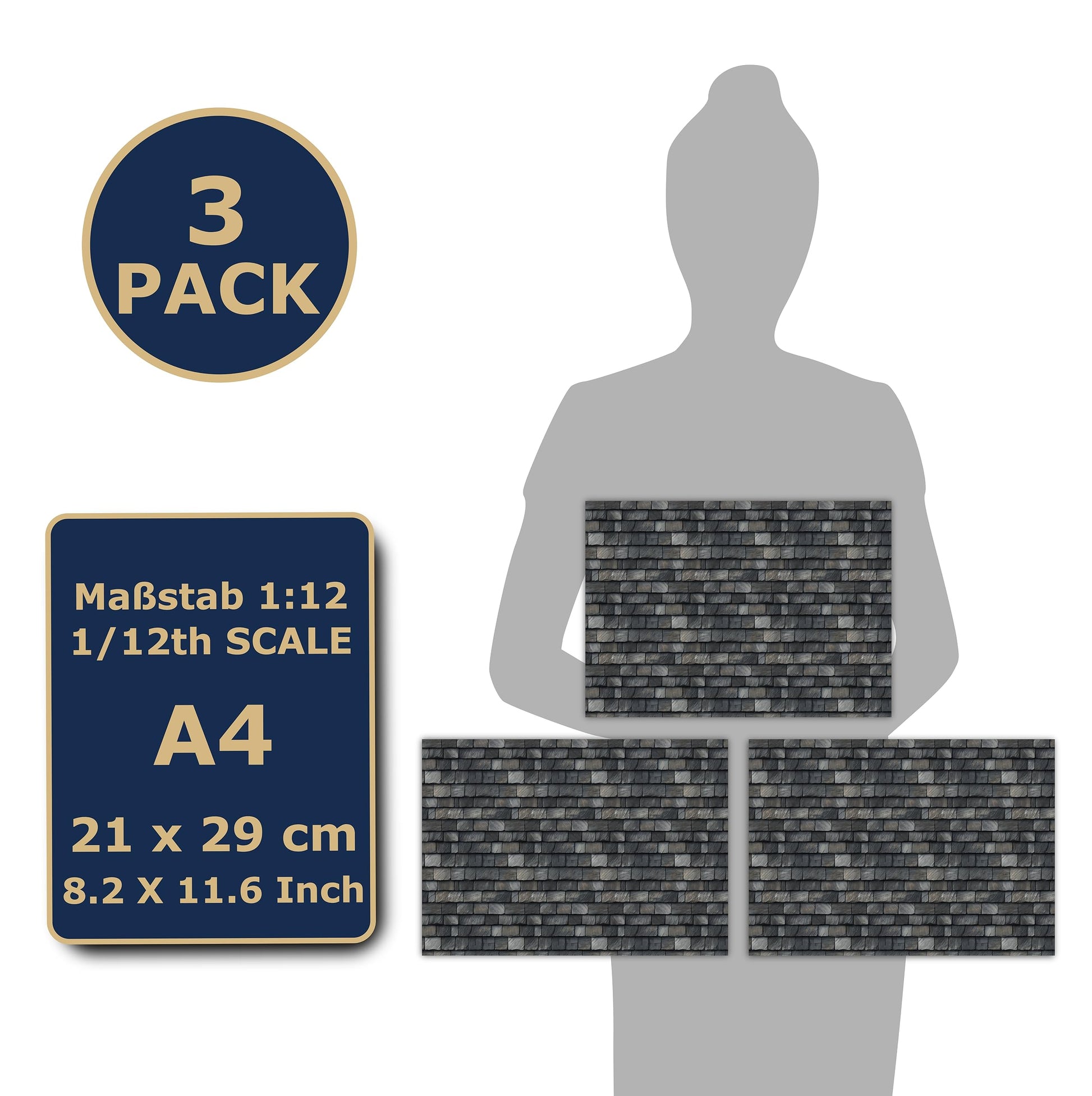 Our roof tiles are crafted in a 1:12 scale, making them the ideal addition to your dollhouse. The product is compatible with various brands of DIY dollhouses or toy houses, ensuring versatility in your modeling endeavors. Each set includes 3 sheets of self-adhesive roof stone texture, sized at DIN A4 (297 x 210 mm or 8.2 x 11.6 inches), providing ample material to cover your dollhouse beautifully.