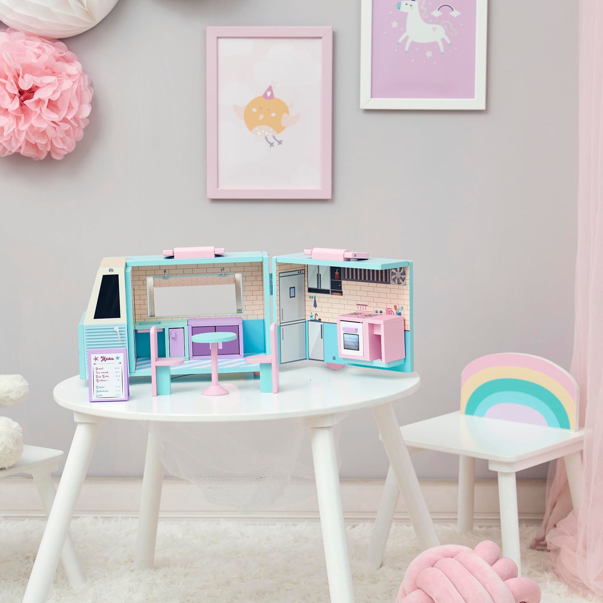 Olivia'S Cafe Food Truck From Olivia'S Little World For 3.5' Dolls Includes Eight Accessories That Can Be Packed Up Inside And Can Be Carried By A Handle, Or Rolled Along To The Next Stop, Thanks To Fully Rolling Wheels. Detailed Illustrations In A Pastel Palette, The Truck Features A Window With An Awning For Ordering, A Sandwich Board For Specials, And A Cafe Table With Two Chairs. A Stove, Sink, Refrigerator, And Counter Can Be Set Up Inside The Truck. Created To Encourage Kids To Use Their Imagination And Creativity, Olivia'S Little World Products Are Certified Safety Tested, Are Lead- And Phthalates-Free Using Non-Toxic Paint, Is Cpsia Compliant, And Meet Astm F963 Standards. Part Of The Teamson Kids Collection, Giving Flight To Fun, Discovery, And Learning Through Beautifully Crafted, Safe, Trend-Right Furniture Pieces And Toys For Kids With A Spirit Of Curiosity And Adventure.