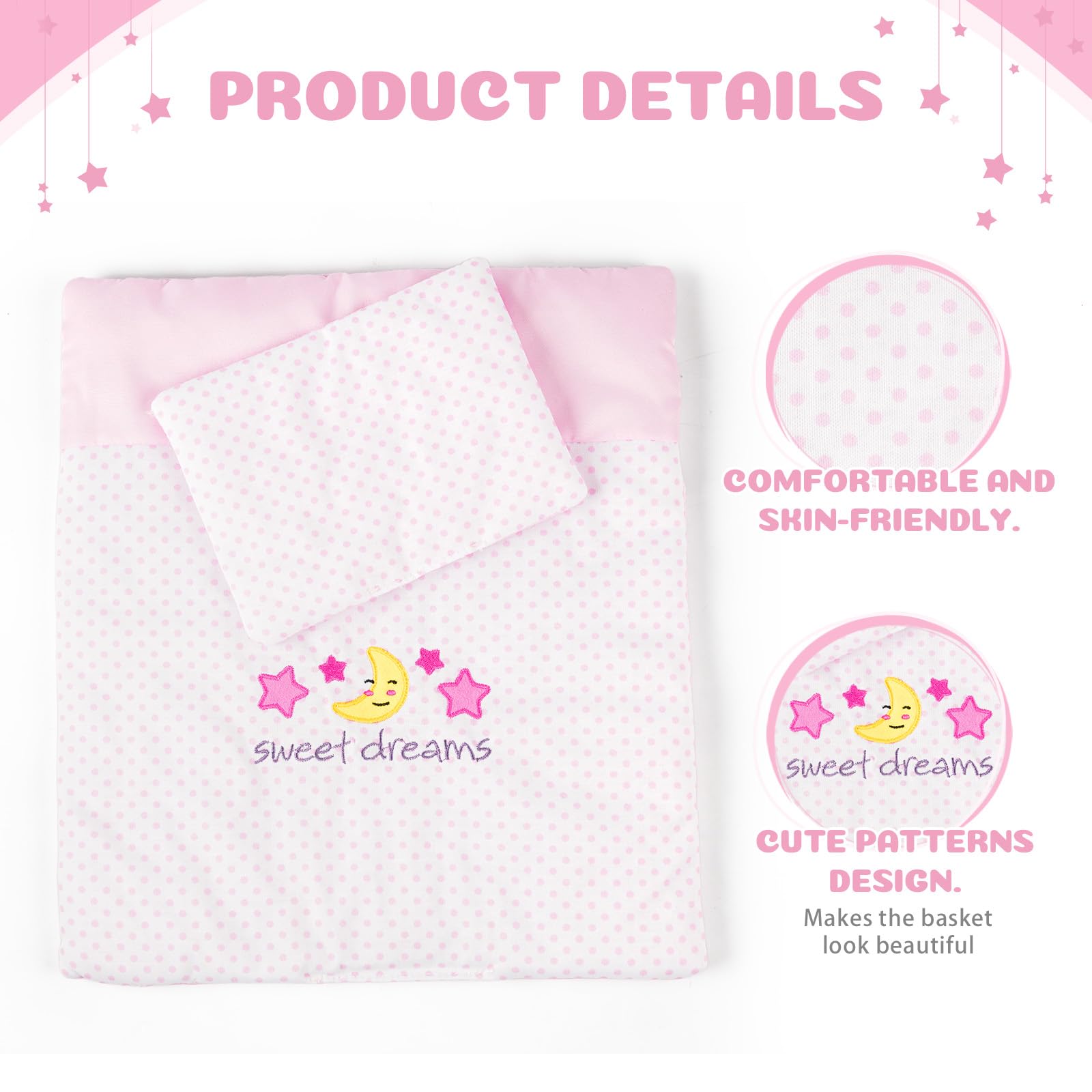 Babeside 2 Pcs Baby Doll Bedding Set For 12-15 Inch Dolls, Pink Polka Dot Baby Doll Blanket And Pillow Set With Cute Moon & Star
