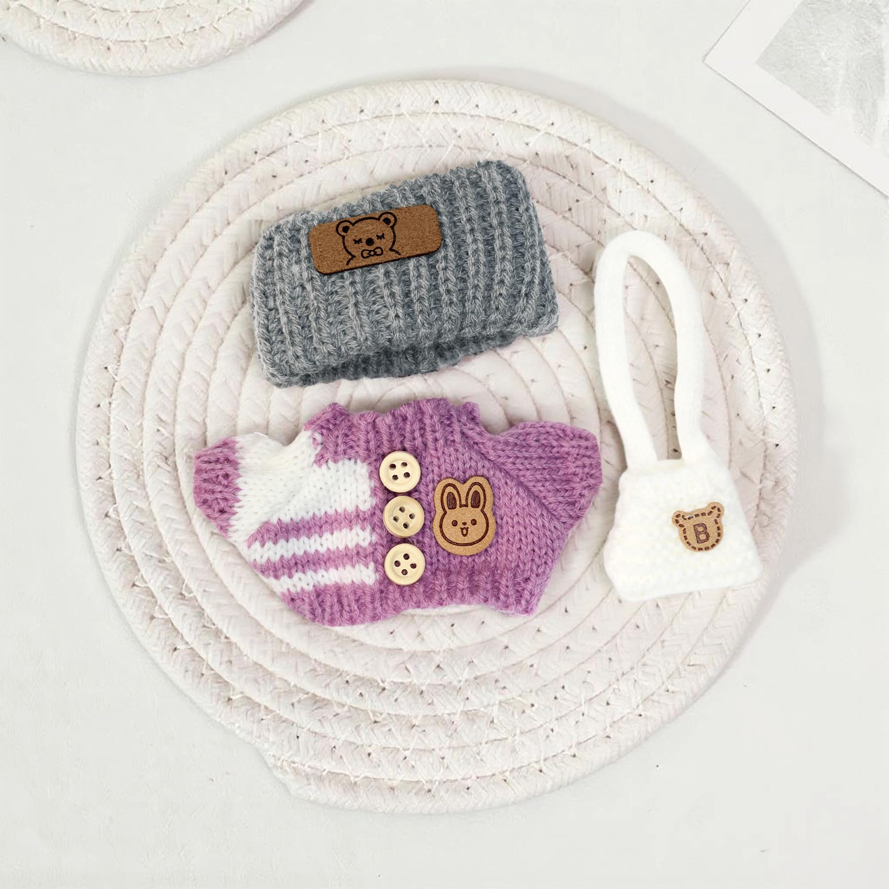 Clothes for 17cm Doll (NO Doll) Handcrafted Crochet Outfits for 17cm Dolls with Accessories Boy and Girl 5-Piece Clothes Set Cute Stylish Clothing with hat and Bag for Dolls Dress up (Purple)