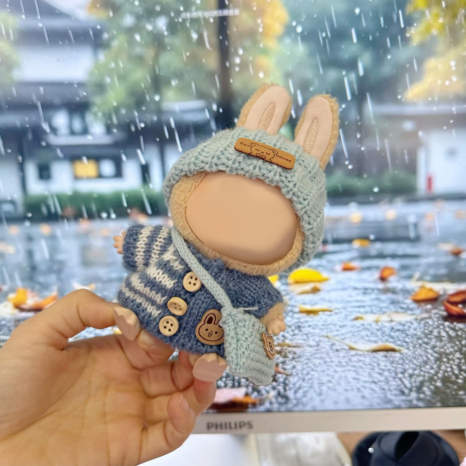 Clothes for LABUBU Doll (NO Doll) Handcrafted Crochet 3-Piece Accessories for LABUBU 17cm Dolls enhanced Outfit - Bunny Sweater + Hat + Bag Cute Clothes for Dress up Unique Style (Blue)
