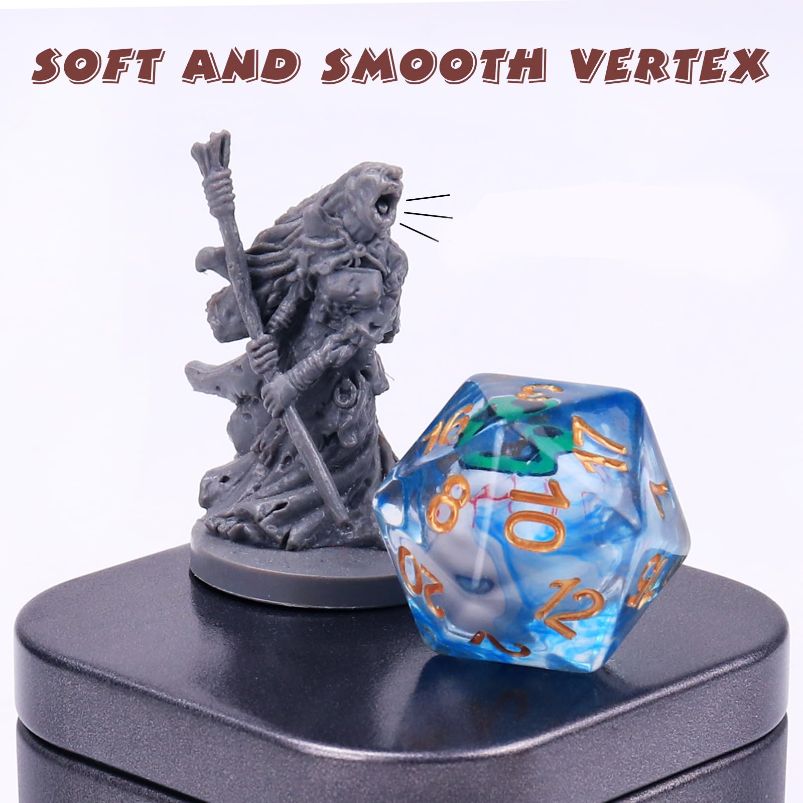 The rolling eyeball D20 bring the game into a world full of attractive mystery and magic, It is a great gift for the DND gamer and beginner.  Rolling eyes D20There is a rolling eye inside the 22mm diameter DND dice. When you throw this D20, you will find that the eyes inside the dice are spinning wildly. When DND dice stops, you will find that your eyes are always looking at the top.Easy reading and cool designThe green monster's eyes are imprisoned in the blue prison, and the golden number as the imprisoned magic makes it a magical D20. Contrasting colors allows you to quickly and accurately obtain the numbers of DND dice. Specifications:Package Contains:D20 x 1Metal box x 1Color:Dice Color:BlueEyeball Color:GreenMaterial:ResinDice size: 22mm