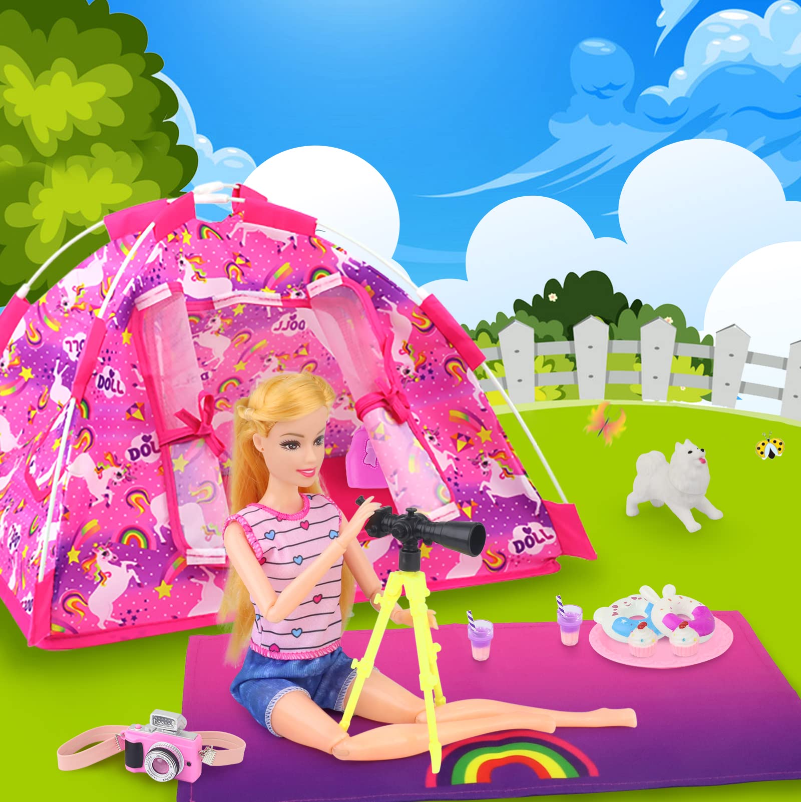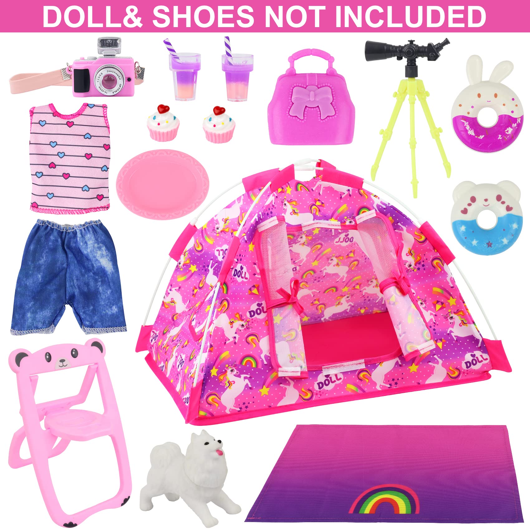 View compareEcore Fun 15 Pcs Doll Camping and Accessories Set for 11.5 Inch Girl Doll Includes Doll Tent Clothes Chair Camera Drink Cupcake Donut Telescope Toy Dog Bag