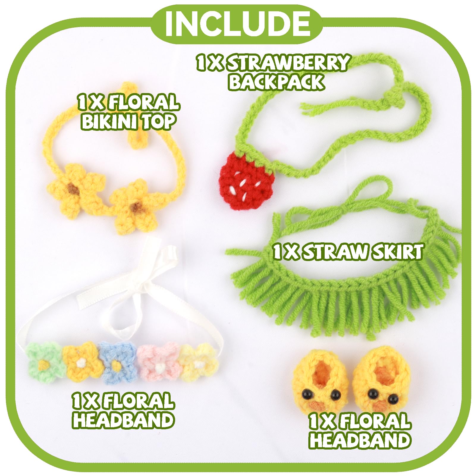 Handmade Clothes for Doll 5-Piece Set Woolen Crochet Doll Clothes 6.7in/17cm Outfits Cute Accessories Includes Chickadee Shoes+Straw Skirt+Bikini top+Floral Headband+Strawberry Backpack