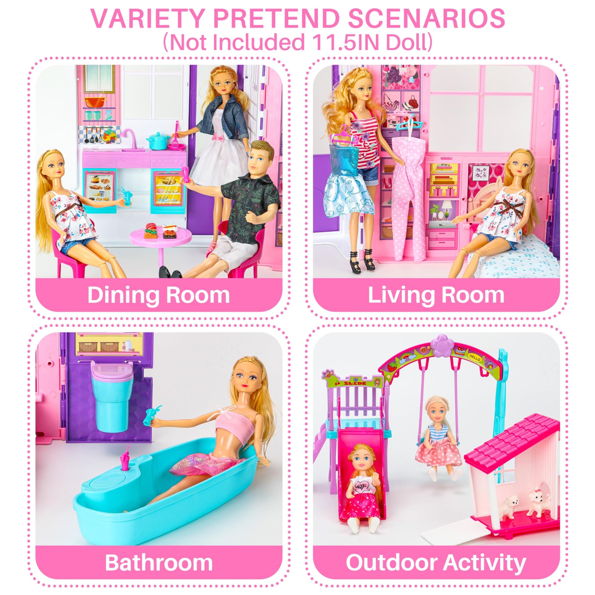Style Shine Doll House Portable & Foldable Dollhouse W/ 60+ Pcs & 2 Dolls, Play House Toy With Bedroom Bathroom Kitchen Furnitur