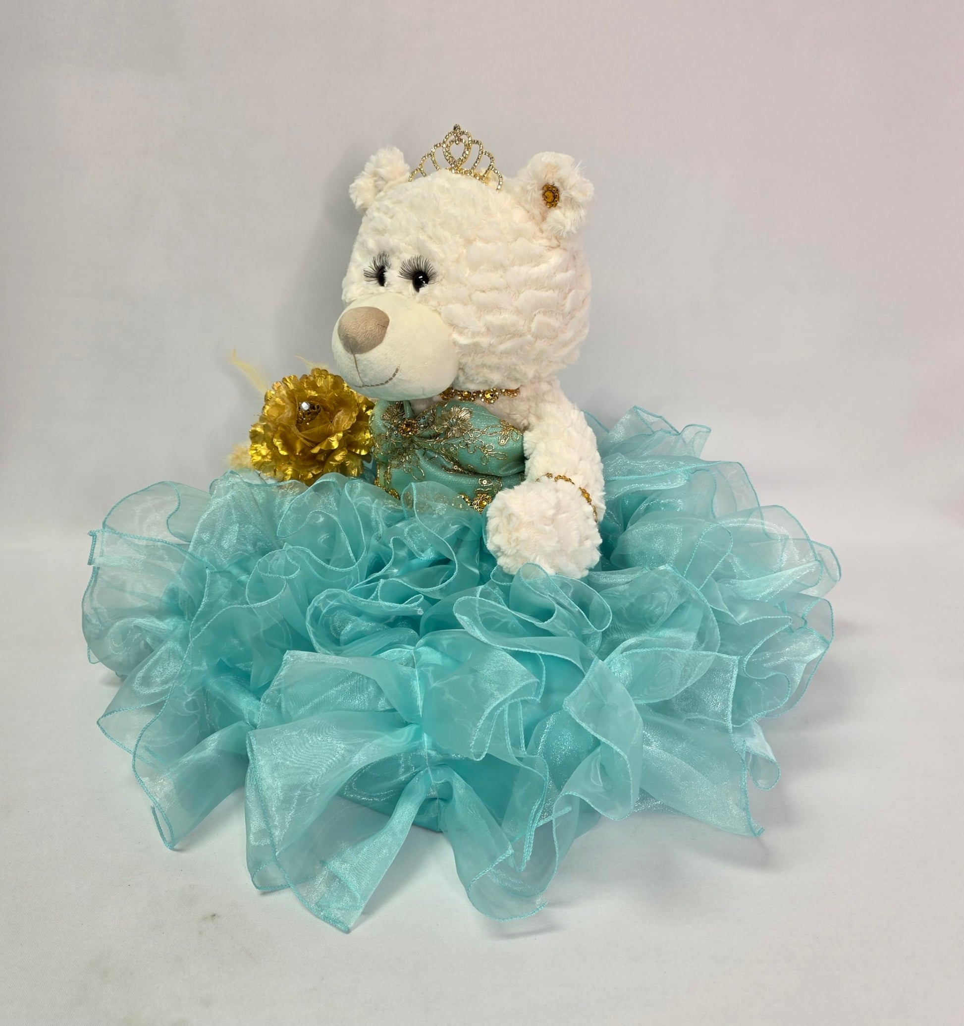For those that are looking for something other than a doll... we now have the option of a Beautiful Elegant Quince Bear Centerpiece. These bears measure 20 long. Crme color, soft and cuddly, dressed in an elegant, glamorous gown. Unique with long curled lashes. The bust of the dress is decorated with sequins and the skirt is made up with multiple layers of ruffles and satin. The right leg of the bear is embroidered with Mis 15 Aos. Complete and accessorized with a little rhinestone tiara, earrings and wrist bouquet.