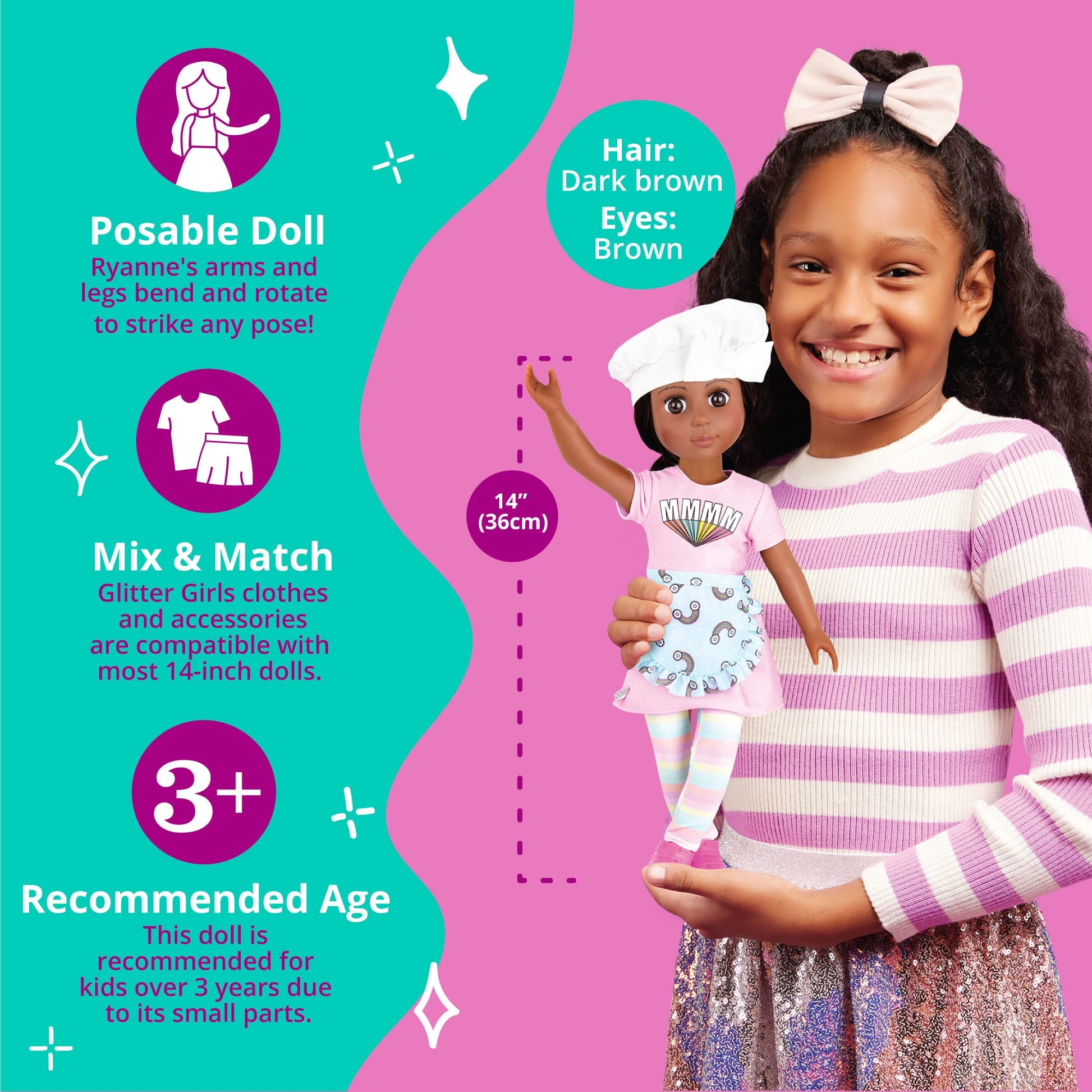 Glitter Girls – 14-Inch Posable Doll – Black Hair & Deep Brown Eyes – Rainbow Outfit & Glitter Shoes – Baker’S Hat & Apron – 3 Years + – Ryanne