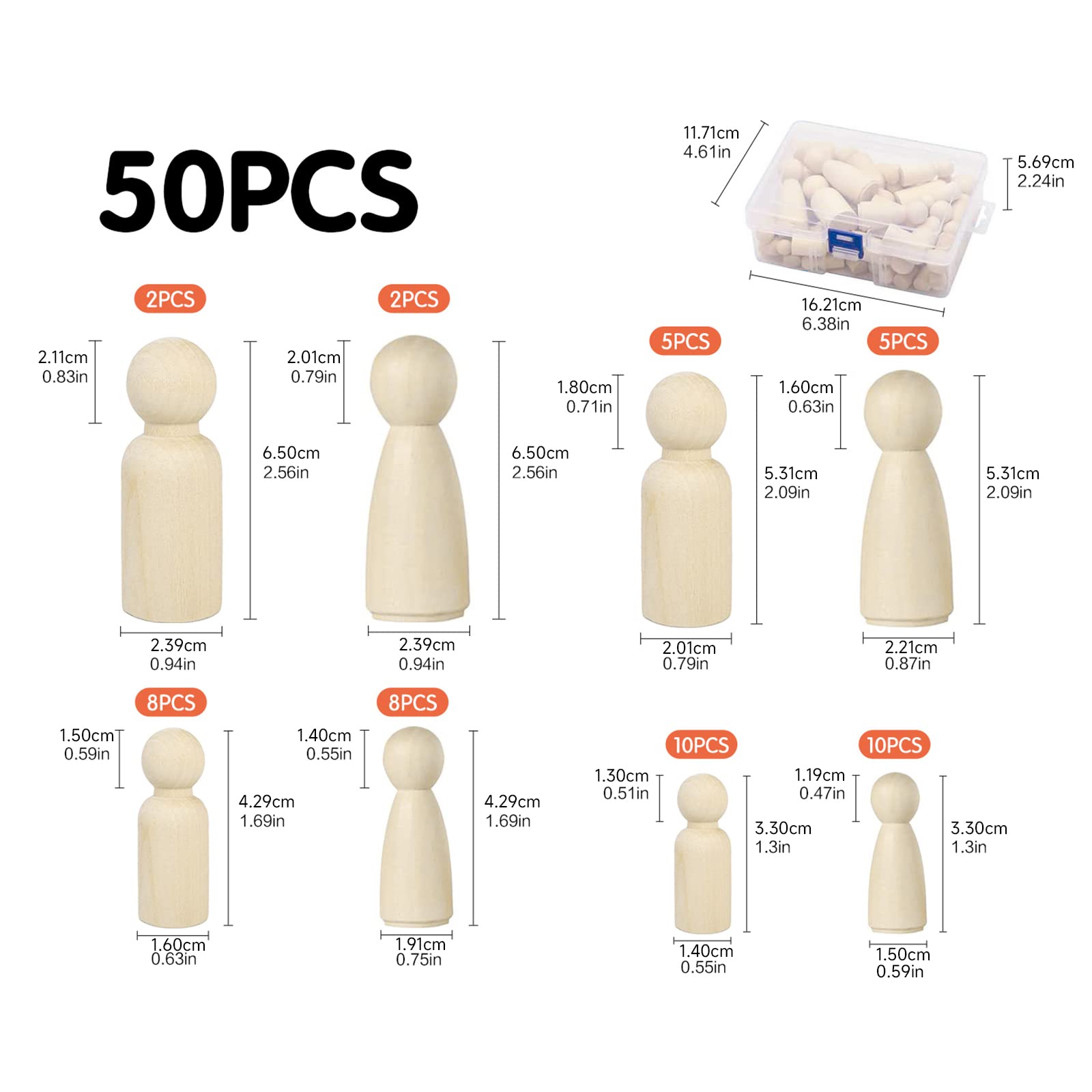 KTHZI Wooden Peg Dolls The dolls are made from safe and solid woods. Easy for kids to paiting on them. Comes with a plastic storage case, the dolls can be put into the case conveniently after using.There are 4 different sizes of the dolls, 20pcs of 33mm dolls, 16pcs of 43mm dolls, 10 pcs of 53mm dolls, 4 pcs of 65mm dolls, each size of doll has 2 shapes.