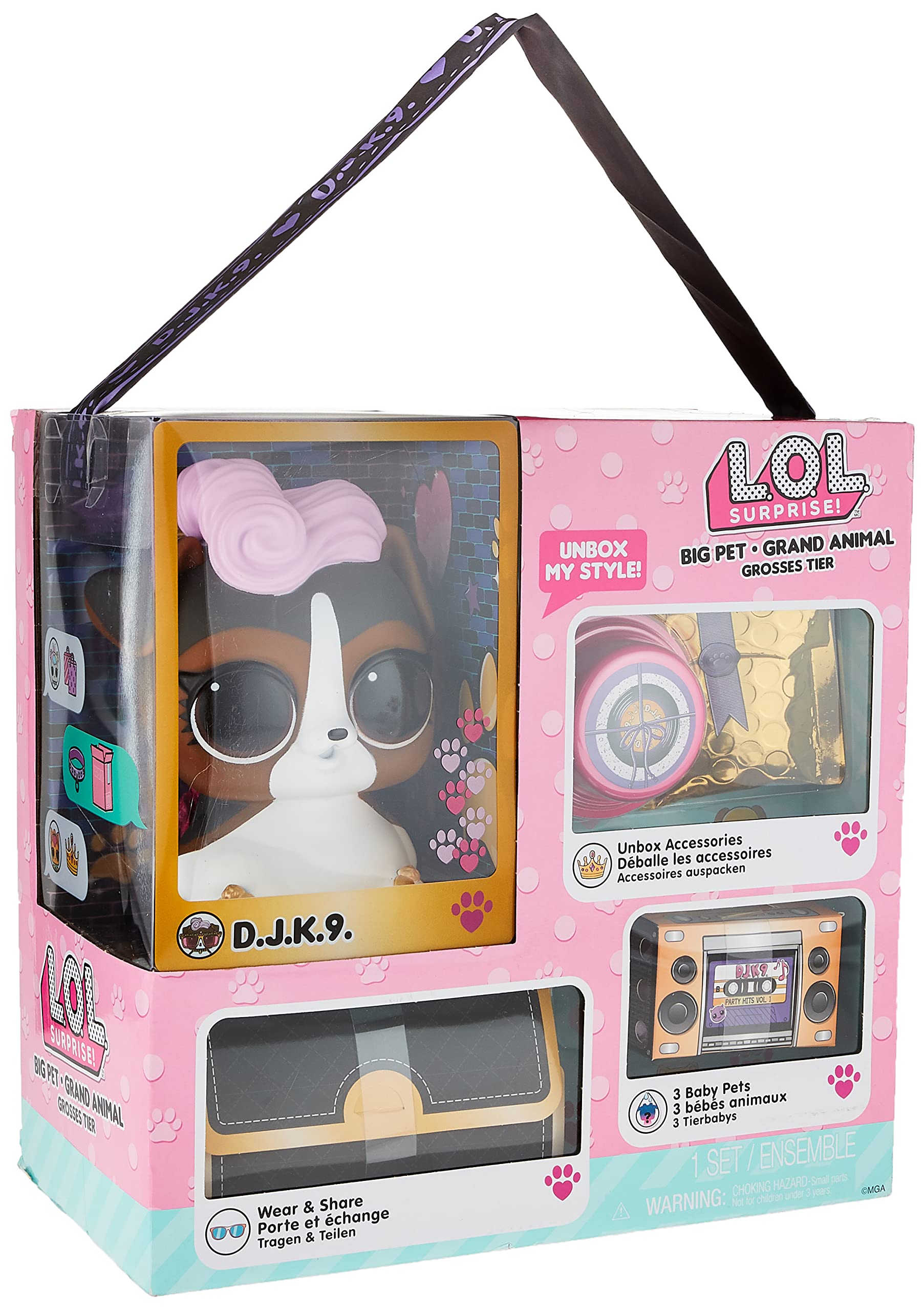 Oh no! LOL Surprise dolls were on a top secret mission when their pet went missing! Unbox 15 surprises with LOL Surprise Big Pet DJ K.9. including a pet carrier basket with 2 pet babies and 1 pet baby charm or food baby charm inside. What will you find? Plus, find surprise clues across the Eye Spy series to help find their pet! L.O.L. Surprise! Big Pets have tons of surprises inside and include wear-and-share accessories for you! Put on the Eye Spy series spy glasses to find codes and unlock surprises, and then share the glasses with your Big Pet! And her necklace becomes a bracelet for you! Comes with 1 wish bone, 1 funny bone, 1 fortune teller heart, 1 baby reveal. DJ K9 can be worn as a backpack or used as a piggybank. Also comes with a rose gold purse carrying case. Collect them all! Look for Hop Hop, DJ K.9. and Neon Kitty to complete the collection. LOL Surprise dolls come with outfits and surprises including wear and share pieces and accessories in a reusable pink box make a perfect toy and playset for kids- as toys and gifts for girls ages 4 to 7 years old and up for imaginative pretend play! As birthday gifts and gift doll for any special occasion, dolls and playset with surprises provide hours of social play with siblings and friends! From MGA Entertainment, creators of LOL Surprise fashion and collectible dolls, Rainbow High fashion dolls, Na Na Na Surprise dolls, Bratz fashion dolls, MGA's Dream Ella fashion dolls, MGA's Glitter Babyz baby dolls, Lalaloopsy, Poopsie Surprise girls dolls, Baby born Surprise Baby Dolls and Collectibles, Little Tikes kids toys and many other favorite brands.