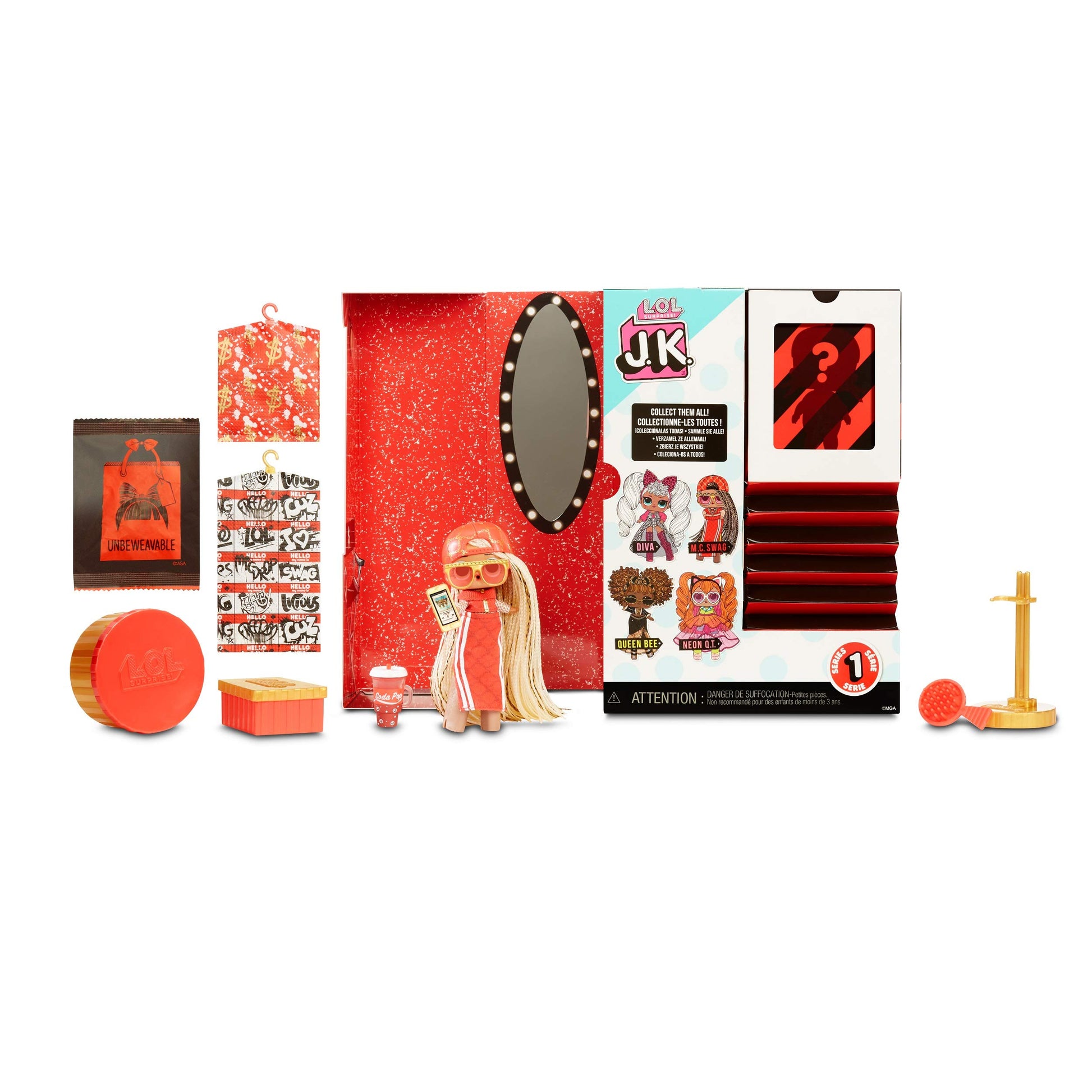 It's just shoes. JK! It's what makes me stand tall! It's just fashion. JK! It's how I express myself! It's just a runway. JK! It's how I take on the world! Unbox 15 surprises including a mini fashion doll with L.O.L. Surprise! JK. Fan favorite character M.C. Swag is back but she got a fierce runway-ready makeover. She now has real styled hair real fashions and real tall shoes. She comes with a totally unique unboxing experience in an outrageous accordion package that makes her picture taller and shorter as you push on it. Slide open the back panel to reveal your mini fashion doll then open the side to reveal her surprises ready to be unboxed from her garment bags shoebox and hat box. Dress M.C. Swag in her real fierce fashions and her real tall shoes. Have her strike a pose to show her off on her included doll stand. Her package even becomes a dressing room playset. Each L.O.L. Surprise! JK includes a mini fashion doll real fashions shoes a shoebox accessories a hat box bottle a hair brush a doll stand and a package that becomes a reusable playset. Collect all 4 L.O.L. Surprise! JK mini fashion dolls.