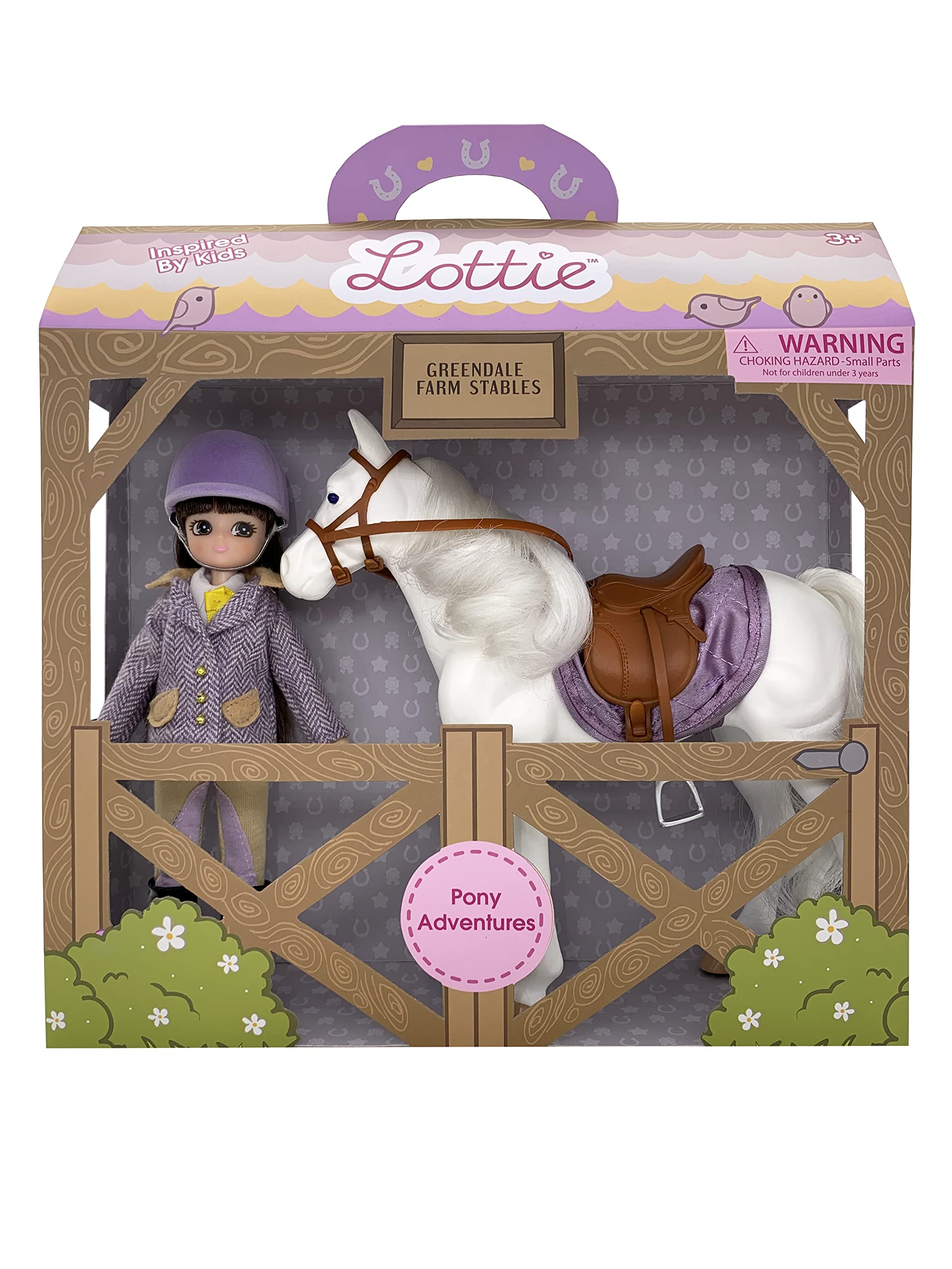 • Q: What components are included in the Lottie Pony Adventures Doll & Set? A: The set includes a white horse with a lilac saddle rug, a lilac herringbone tweed jacket, a white riding shirt with a yellow tie, lilac and beige riding trousers, black riding boots, and a lilac flocked helmet.
