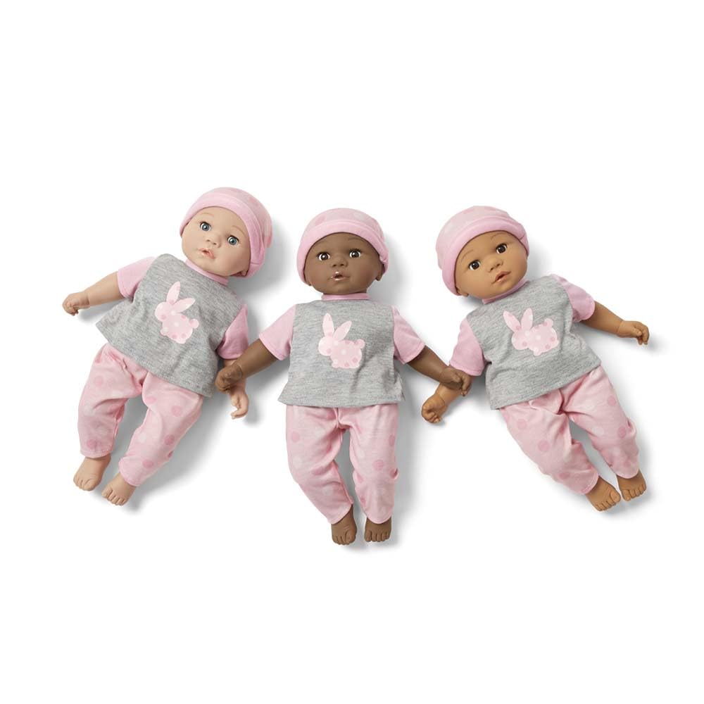 20210 - 14” Sweet Smiles – Pink . This adorable 14” baby is just the right size for your child to snuggle . Baby has a soft body, a weighted bottom and molded head, legs, and arms so it feels so real to your child . Baby’s gently smiling face has sleep eyes, facilitating bedtime play. Dressed in an adorable bunny tee, polka dot leggings and matching cap. Engage your child in imaginative, nurturing play with this doll, teaching kindness and empathy. Doll wipes clean with damp cloth. Shipped in a window box. Includes bottle.Recommended for 12 months and up. Features light skin and blue eyes; soft body and molded arms and legs.