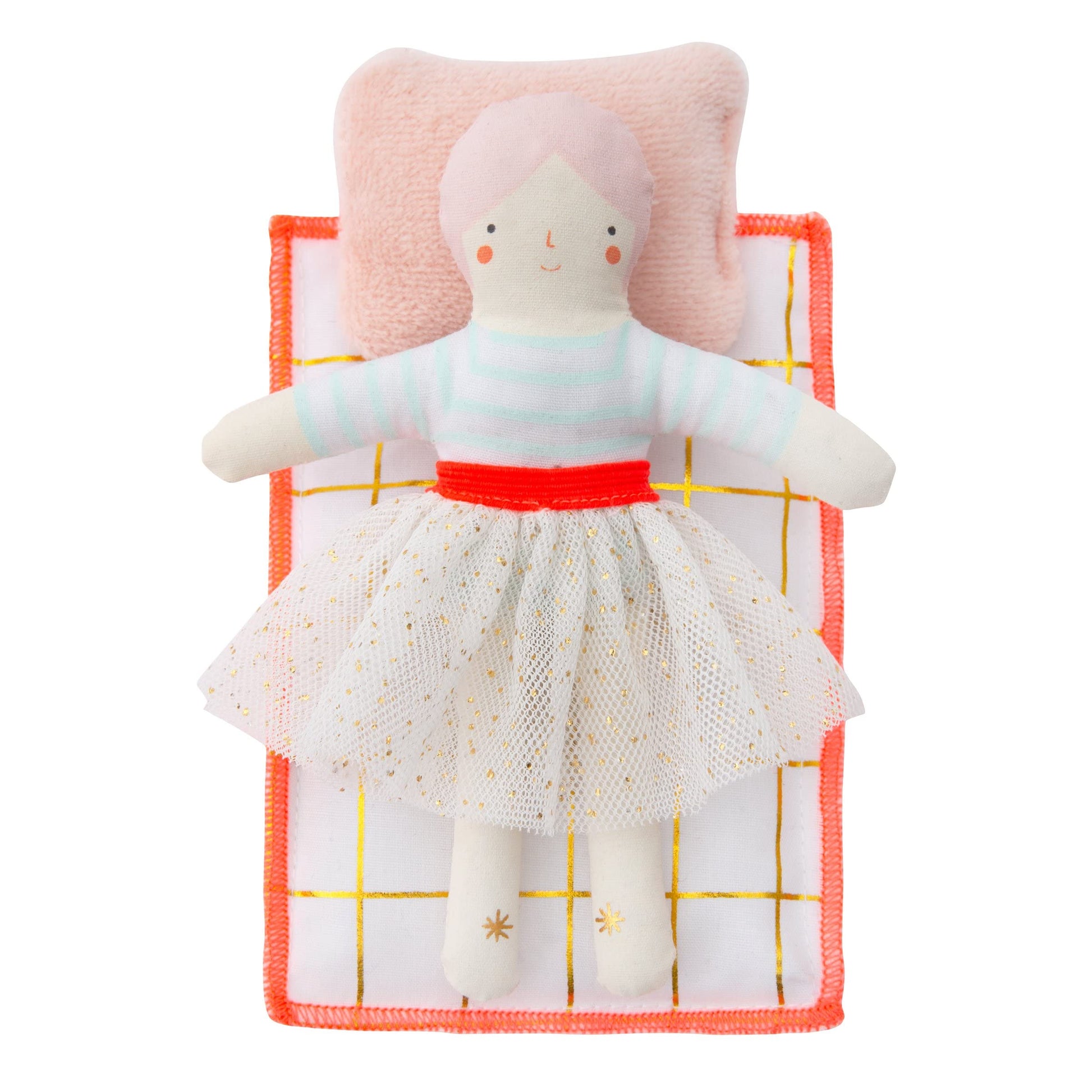 Who's hiding inside this charmingly illustrated suitcase? It's Matilda, a remarkable little doll with a sparkly tulle skirt! She comes with a velvet pillow and a softquilt for her to cuddle with when it's time for bed. Cotton doll with white tulle skirt. Cotton quilt & pink velvet pillow. House case with leather handle & metal clasp. Neon stitching & gold foil detail. Pack dimensions: 5.25 x 4 x 2 inches