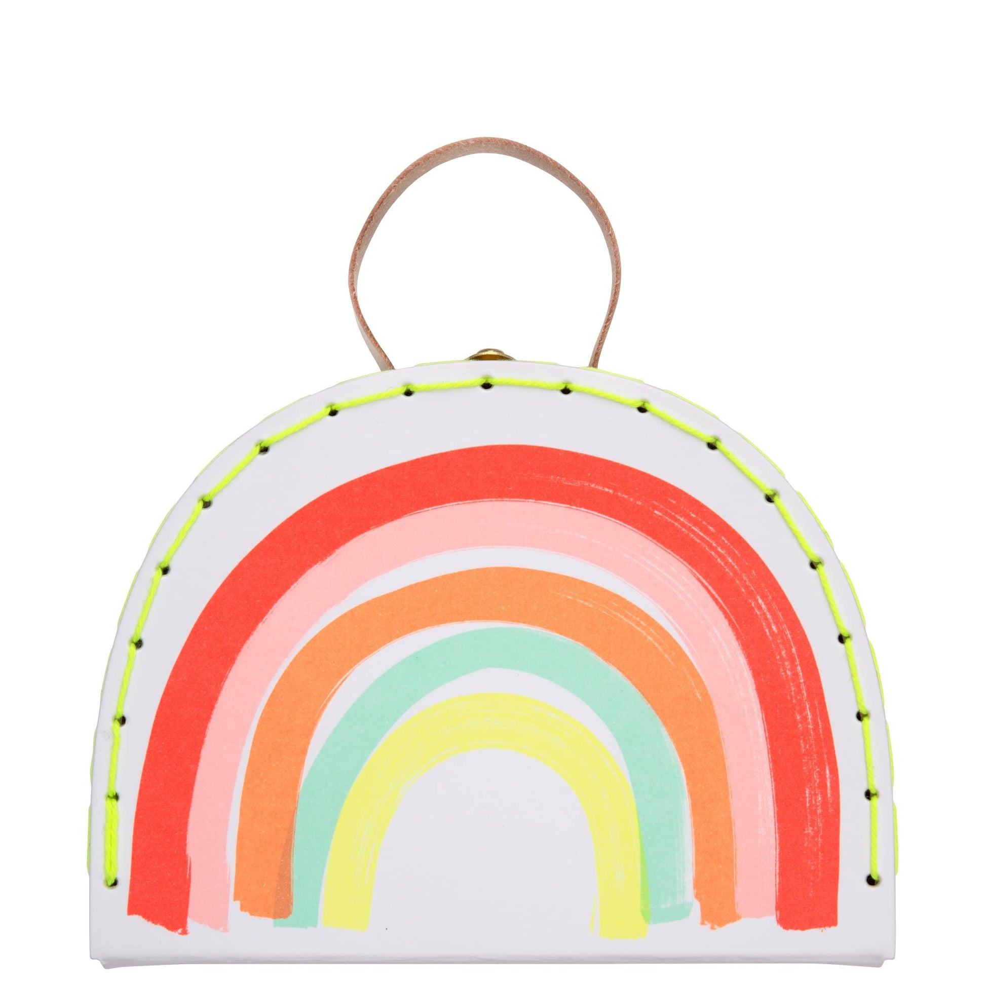 - Q: What materials are used in the Meri Meri Unicorn Mini Suitcase Doll? A: The Meri Meri Unicorn Mini Suitcase Doll is crafted from soft cotton for the unicorn and features a white velvet sleeping bag. The suitcase is designed with a rainbow pattern and includes a leather handle and metal clasp for added charm.