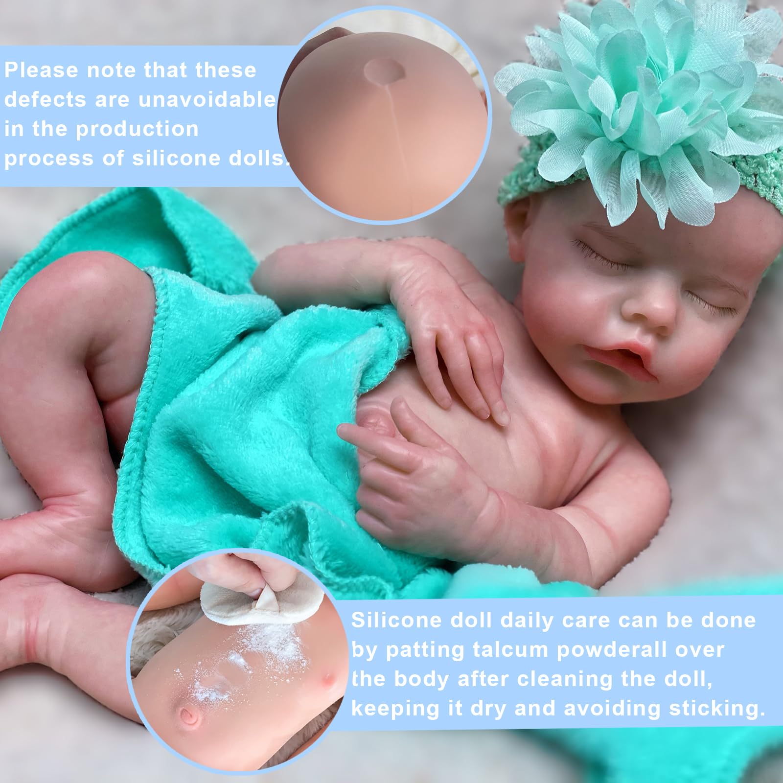 Full Silicone Doll: Washable Full Platinum Solid Silicone Body weighs about 2.65kg(5.8lb). Around 18 inches from head to toe like newborn baby.Absolutely different with the hollow vinyl baby doll,full silicone makes her feel like a real baby in your arms.Gentle touch, perfect for holding, rocking and cuddling.Anatomically Correct and waterproof, can be bathed with your baby.Please take care of silicone baby, don't pull her and be gentle when bath or change clothes for her. | Distinct & Delicate Painting Features: Handmade by talented artists. Eyes closed with hand rooted eyelashes,can