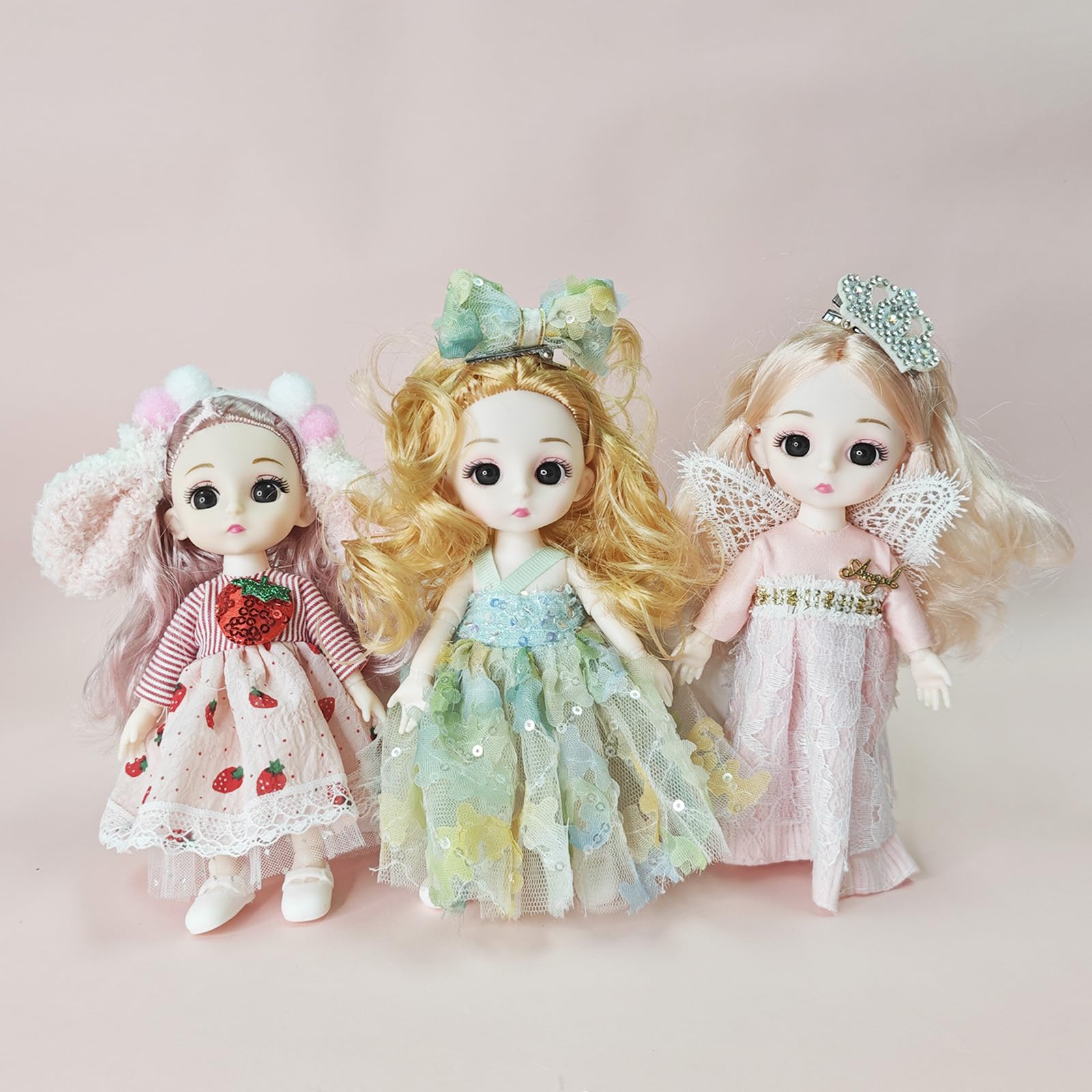 ?Package Included?3 pcs 6.5-inch princess dolls, 3 different princess dresses, 3 pairs of shoes and hair accessories. ?Adjustable Arms and Legs?With 13 adjustable features for each princess, our little dolls can be easily positioned to sit, stand, hold hands, make gestures and more. ?Detachable Accessories?The doll's skirt, headpiece and shoes are all detachable. Your child can create their own unique look for each princess doll. ?Exquisite Details?Each doll has detailed hair styling and sculpting. Glittery and sophisticated, these dresses are perfect for bringing your child's fairy tale dreams to life. ?Souvenir for girls?This mini doll set is a unique souvenir for girls ages 3 and up. Can be used as a birthday souvenir, Christmas souvenir.