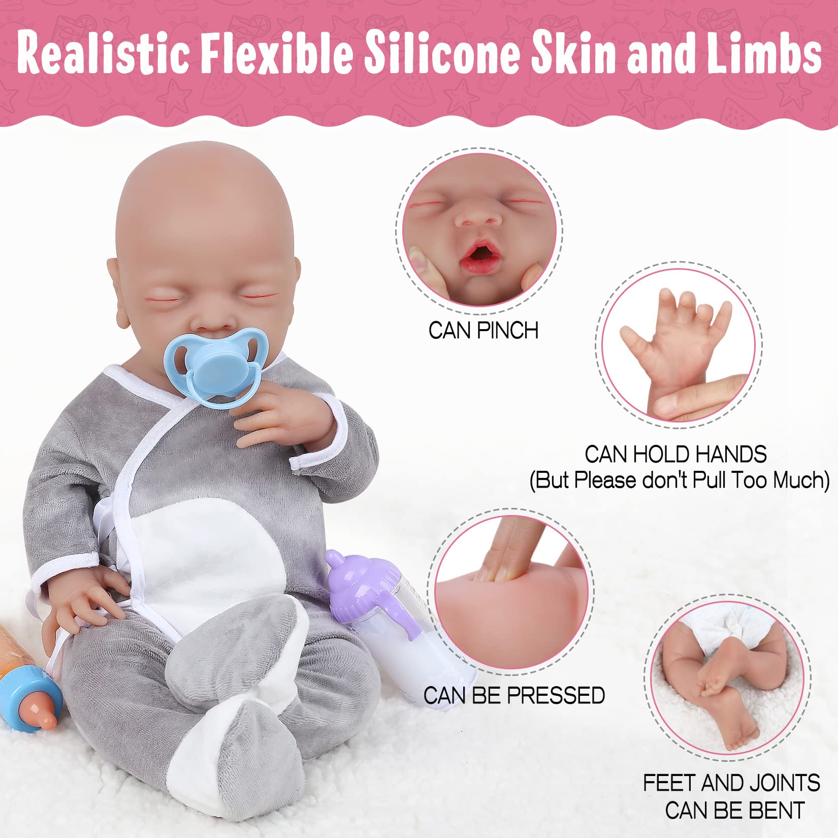 ?? Realistic and Soft: These dolls feature finely detailed skin with a gentle, elastic feel, replicating the softness of a baby's delicate skin, Lifelike facial features, fingers, and toes provide an authentic hugging and cuddling experience for children | ?? Waterproof and Bath-Friendly: Our dolls are waterproof features, allowing safe bathing; Kids can practice real baby care routines, promoting hygiene awareness and responsibility | ?? Fostering Family Bonds and Education: Our full silicone baby dolls are more than toys; they strengthen parent-child relationships; Interactive play helps children learn caregiving, playtime, and educational scenarios, nurturing responsibility, empathy, and vital life skills; This interaction deepens family connections and creates a warm home environment | ?? Versatile Uses: Ideal as gifts from family members to children, our dolls cater to various households and enthusiasts; They also double as stress-relief tools for adults and can be used as props in infant education videos; The versatility of our full silicone baby dolls offers different experiences, including companionship, collecting, relaxation, and educational enjoyment