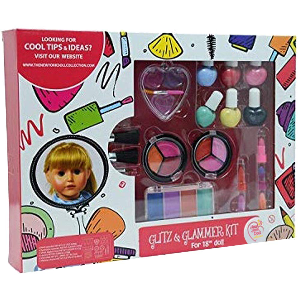 Hours Of Play With This Real Cosmetic Set!Package Includes:7 Brushes And Applicator6 Colors Blush (Bubblegum Pink, Deep Pink, Hot Pink, Red, Burgundy, Apricot) 4 Colors Eyeshadow (Seafoam Green, Burnt Sienna, Lavender, Blue) 5 Colors Lipstick (Pink, Purple, Orange, Fuchsia, Red) 3 Colors Lip Gloss (Pink, Purple, Glitter) 6 Colors Nail Polish (Pink, Red, Blue, Black, Yellow, And Green) 3 Makeup And Nail Polish Remover Cape For 18 Inch Dollyour Doll Will Be Thrilled And Excited To Get Ready For Any Occasion She Has Give Her That Flawless Makeup Look With This High Quality Cosmetic Set. Shes Gonna Love Looking Pretty And Glammed Up For Any Occasion Or Event. Manufactured By The New York Doll Collection , A Modern Company For Dolls And Kids.Easy To Use:The Makeup Kit Is Easy To Use For Any Kid As They Do Not Need Any Kind Of Training Or Skill In Order To Apply Makeup On Their Dolls.Best Choice:Best Choice For Little One To Make Them Happy And To Encourage Them For Creative Play. Your Daughter Will Love This Glitz And Glamour Doll Makeup And Cosmetic Set.Child Safety:Materials Used Are Safe And Easy To Operate Made With Top Quality Material Tested Through Usa Safety Standard.