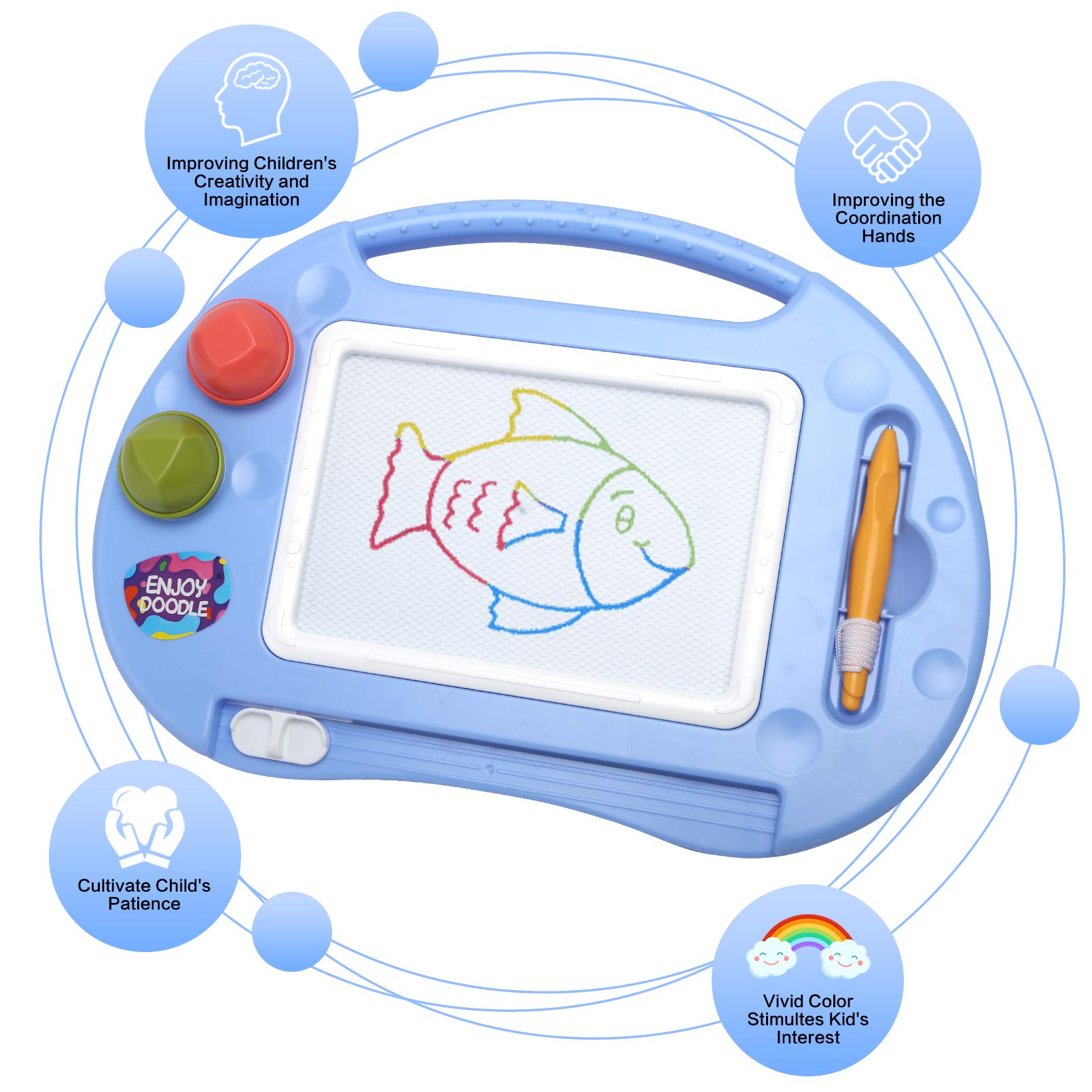 - Q: How does the magnetic drawing board help in learning colors and writing? A: The board features four color zones—red, blue, green, and yellow—which help children learn colors while doodling. Additionally, it allows toddlers to practice writing and arithmetic, fostering their creative imagination and fine motor skills.