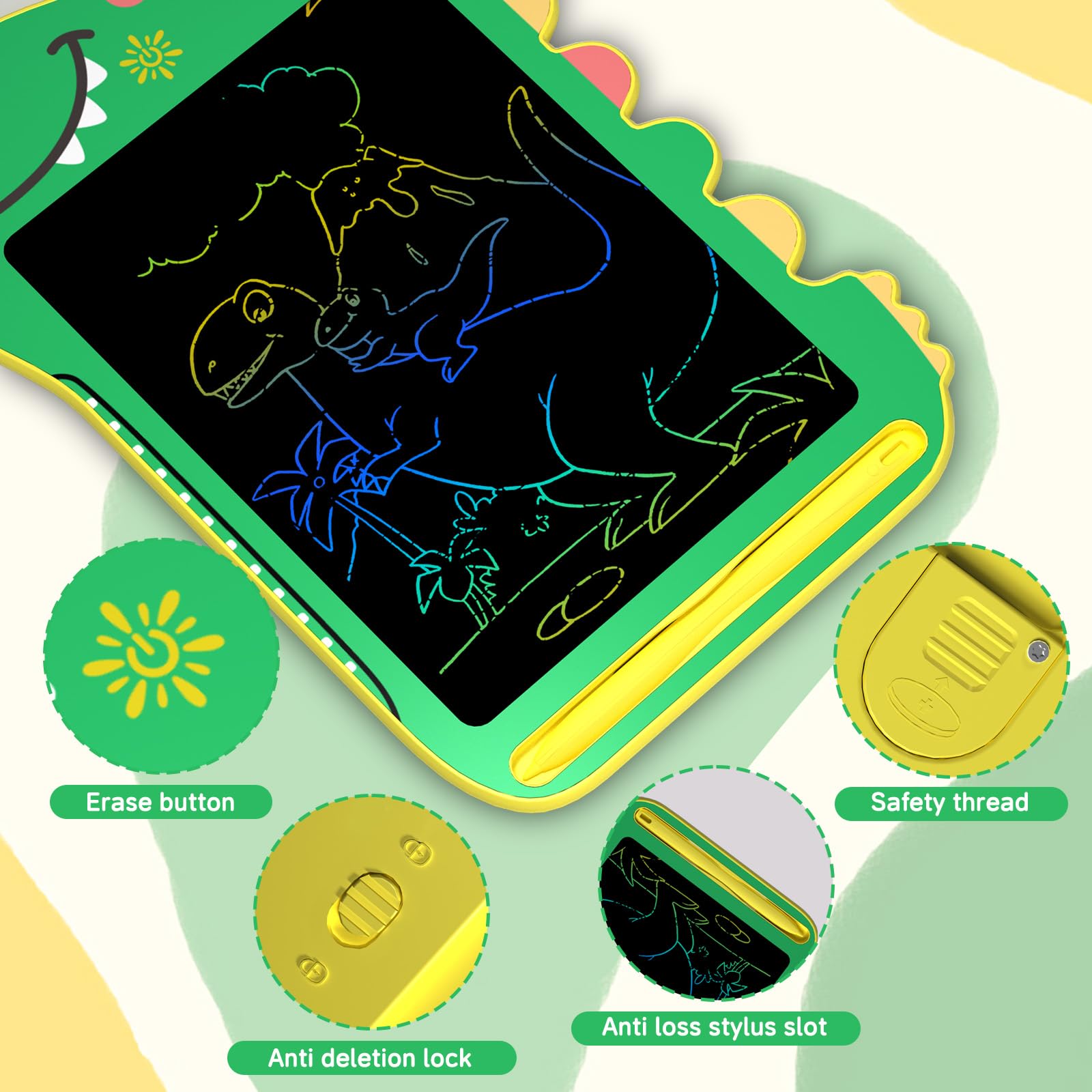 This 8.5-inch LCD writing tablet is perfect for kids to draw, write, and learn anywhere, anytime. It features a colorful screen with eye protection, a one-button erase, and a screen lock to save important drawings. Lightweight and durable, its ideal for travel, school, or home use. The reusable design replaces paper and lasts up to 100,000 uses with no charging required. A great gift for boys and girls aged 3-7 that inspires creativity and learning without the mess. lcd writing tablet for kids educational toddler dinosaur toys for ages boys 2-4 2-3 4-6 2 3 4 5 6 7 8 year old boys girls birthday christmas gift juguetes para nios Dinosaur Toys for Kids 3-5 little kids drawing pad 1-3 3+ gifts 3-4 doodle board games