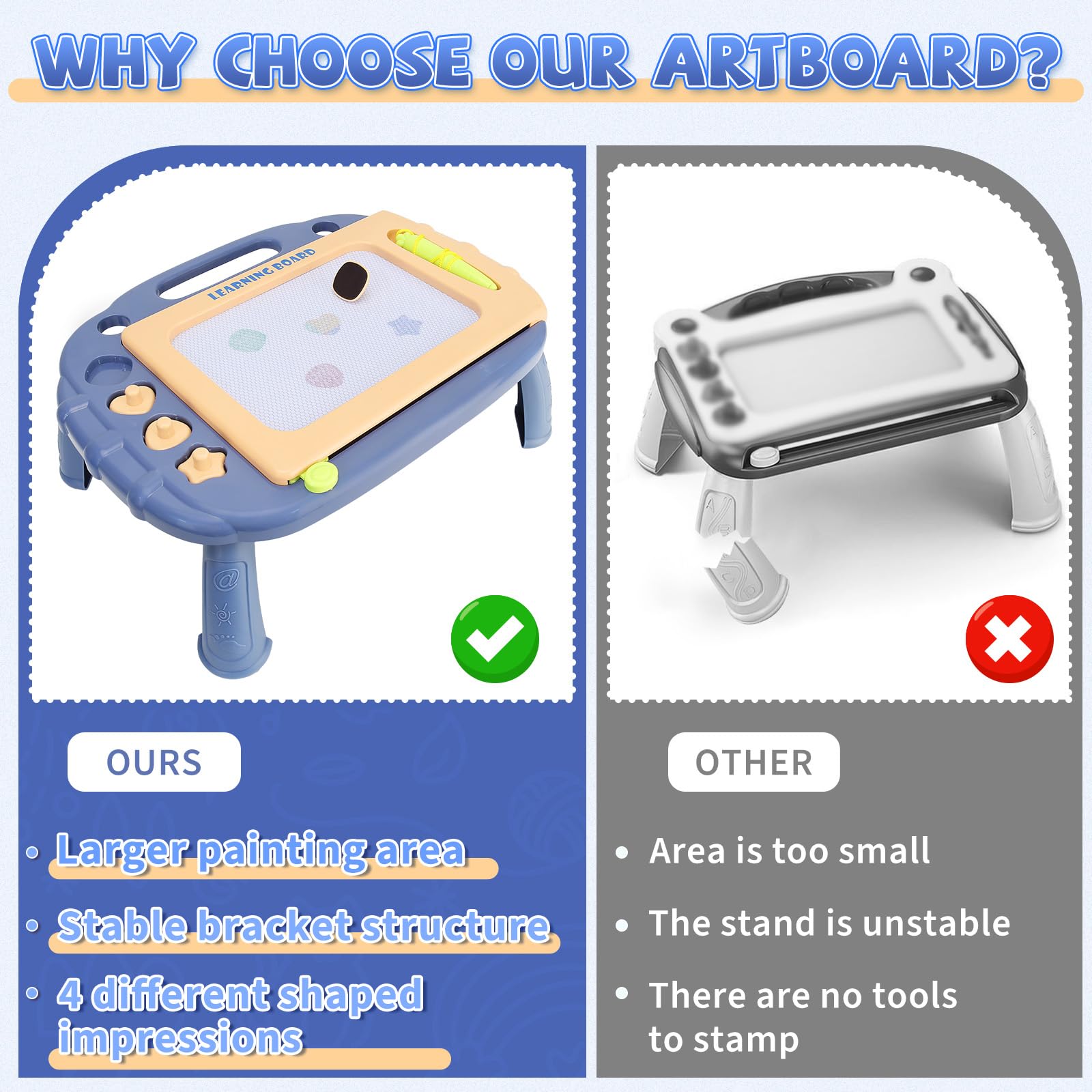 Learning Toys for Toddlers 1-3 Tablets, Magnetic drawing board for kids is divided into 4 colored areas of red, blue, green and yellow. The bright colors are more likely to arouse toddlers interest, and they can draw colorful paintings. This graffiti board includes 4 different shaped stamps to add more fun to drawing. Its perfect as a birthday gift, Christmas gift for 1 2 3 year old boys and girls. Its also a relatively inexpensive way to let your kids enjoy endless art and education.