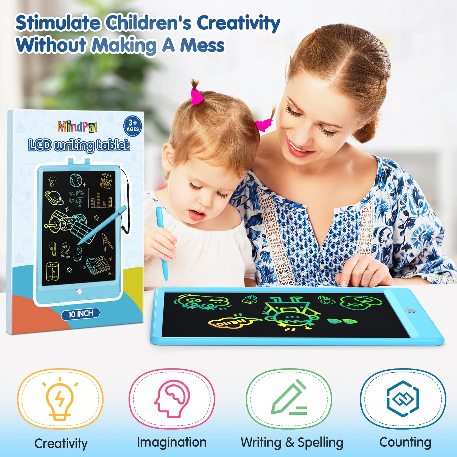 MindPal 10 Inch Drawing Tablet, LCD Writing Tablet for Kids, Colorful Doodle Board Toddler Drawing Pad, Educational Learning & Travel Essential Kid Toy for 3 4 5 6 7 8 Year Old Girls Boys (Blue)
