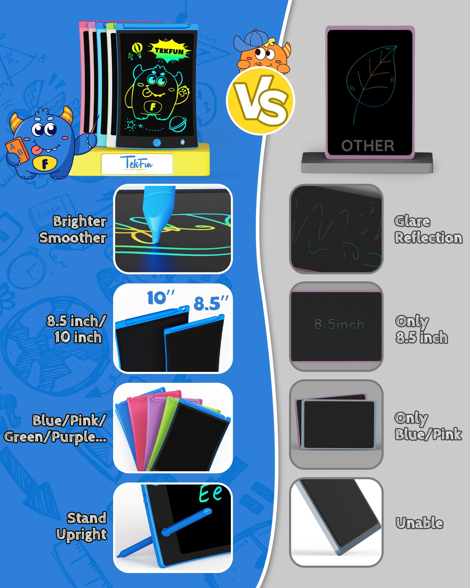 Spark Creativity: TEKFUN drawing pad is the perfect tool to ignite your childs imagination and creativity. With the ability to draw, doodle, write, and play games, your childs patience, creativity, and hand-eye coordination skills will improve in no time. | 2 Packs for Sharing: We saw many scenes of children fighting for a single toy. So we include 2 packs of TEKFUN writing tablets for families with multiple children to avoid a war. Plus, the two drawing pads come with a total of four brushes, in case you want to join the kids painting time or if your brushes get lost | Eye-Friendly: Say goodbye to blue light and glare with TEKFUNs LCD screen. Your child can draw for hours without straining their eyes, making it a great electronic alternative for preventing visual impairment. | Mess-Free: No more messy whiteboards! TEKFUNs doodle board is the perfect solution for parents who want to avoid the mess of traditional painting modes. With the ability to erase and start over more than 10,000 times, your child can enjoy endless doodling without any mess. | Eco-Friendly: TEKFUNs LCD doodle pad is a great gift for nature lovers. With the ability to be used over 100,000 times, it saves up to 100,000 pieces of paper, which equals 3 trees. Let your child be creative without wasting paper and protect the environment at the same time. | Perfect Gift: TEKFUNs writing tablet is the perfect toy gift for kids of all ages. Whether its for a birthday, Christmas, Easter, Valentines Day, or back-to-school supplies, this multi-use toy is suitable for 3-7-year-old boys and girls, as well as teens and adults.