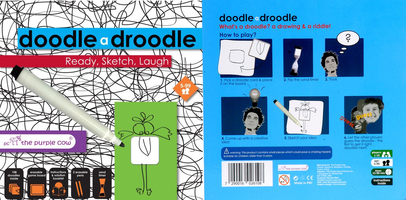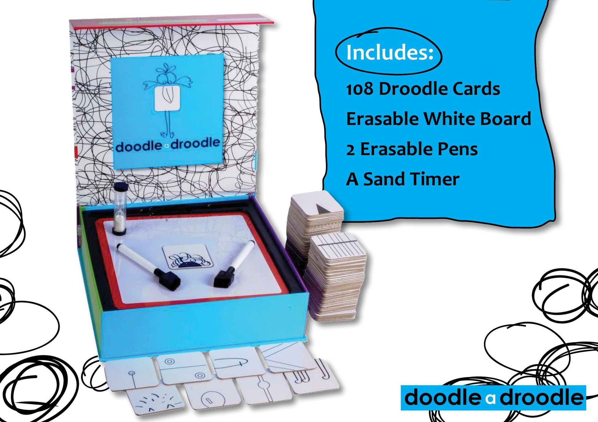 - VALUE: Droodles includes 108 doodle cards, an erasable whiteboard, 2 erasable pens, a sand timer, and an instruction booklet. All come in a sturdy magnetically sealed box. Suitable for ages 5-99 years old.